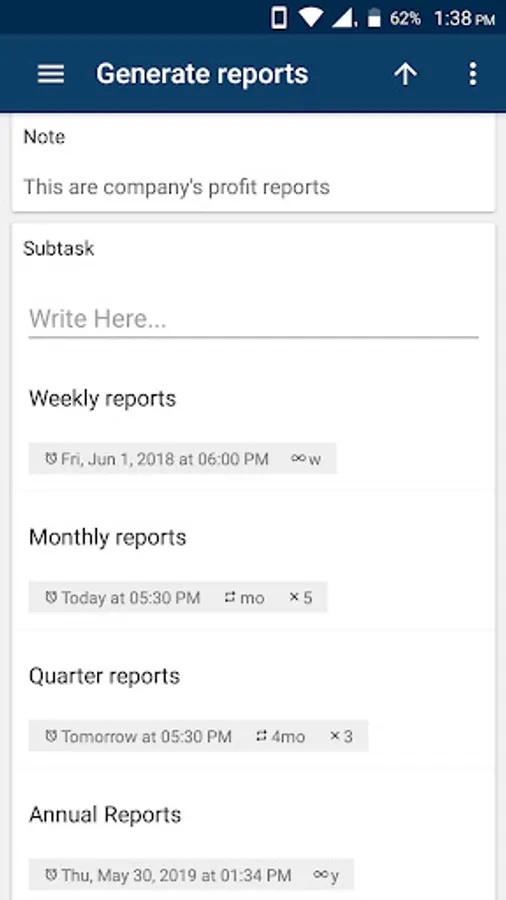 For e.g. you can set reminder in your to do/task/sub task for tomorrow at 6:00 PM and repeat every week for 3 times. you can set reminder for every Monday at 11:00 AM for repeat infinite or for 7 no of times as per your choice etc.