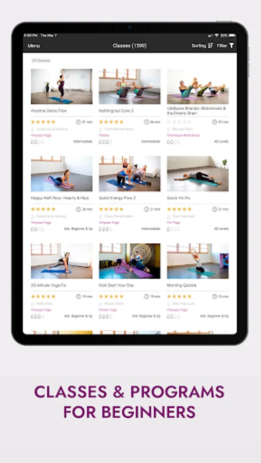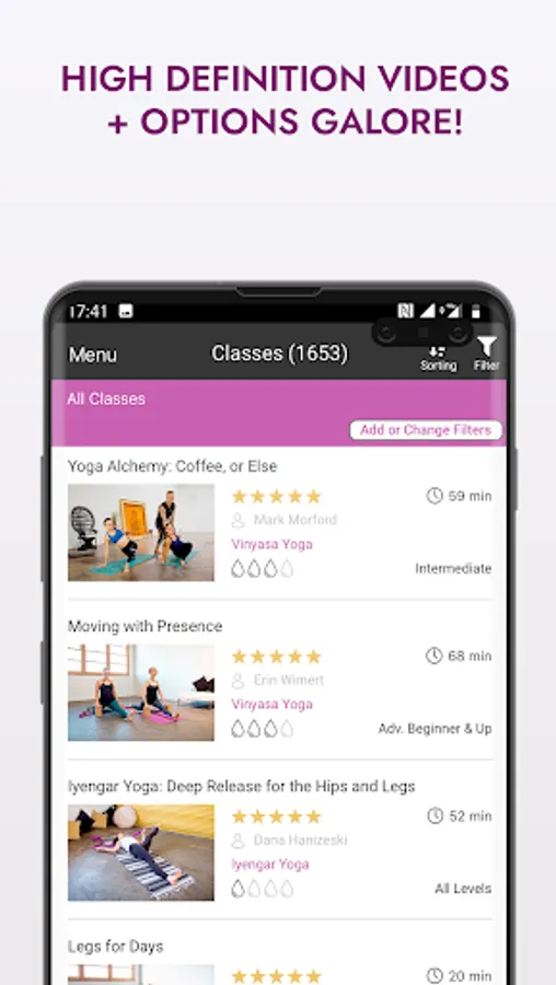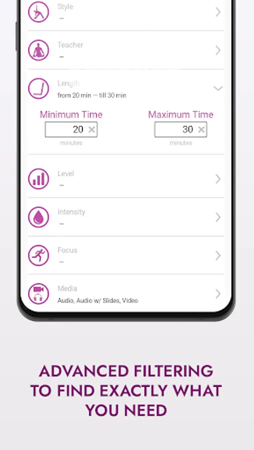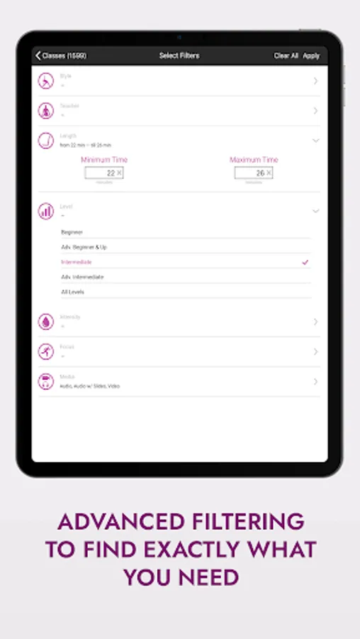 - Advanced filtering to find your perfect class. Filter by length, level, intensity, style, teacher, and even a specific goal or focus
