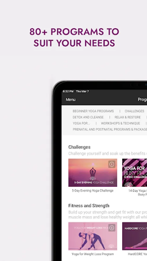 - Achieve your goals with 80+ expertly curated programs including Absolute Beginner Programs, Yoga for Weight Loss, Heal Your Back Pain, Yoga for Runners, challenges, prenatal programs + more.