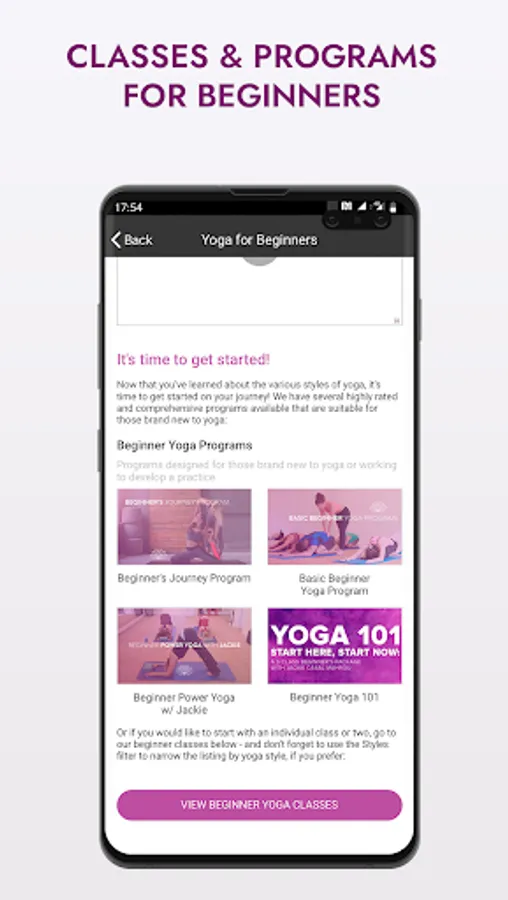 - We have many classes, yoga plans, and programs that are designed for absolute beginners (yes it’s your yoga for beginners free app) or those that have just a little experience with yoga