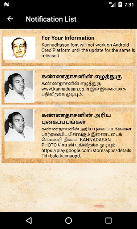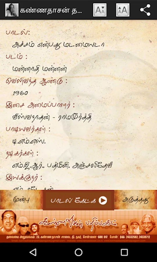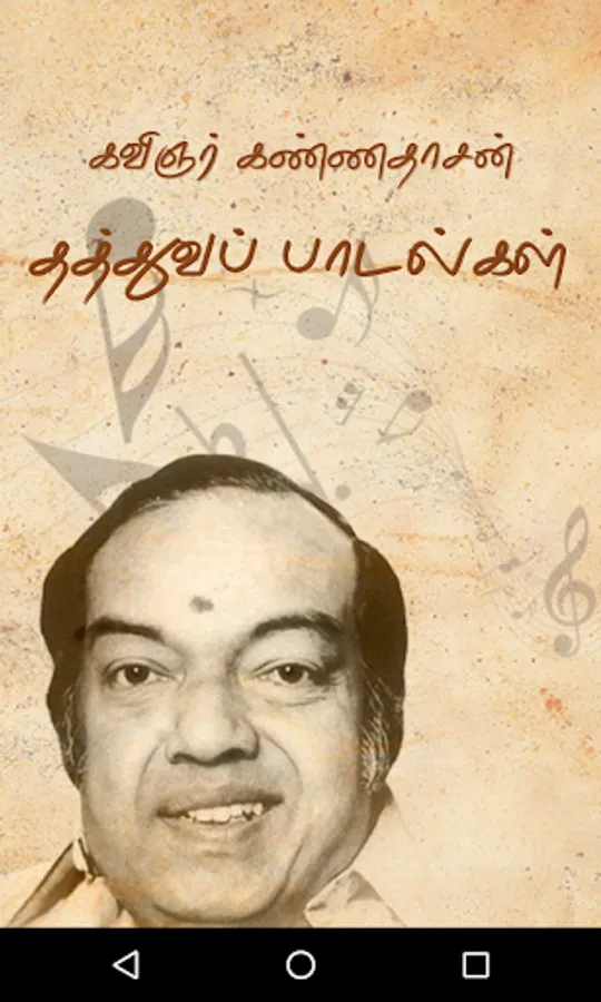 This App is an initiative by Kannadhasan Pathippagam, it comprises of 200 Kannadasan Thathuva Padal varigal with play option.