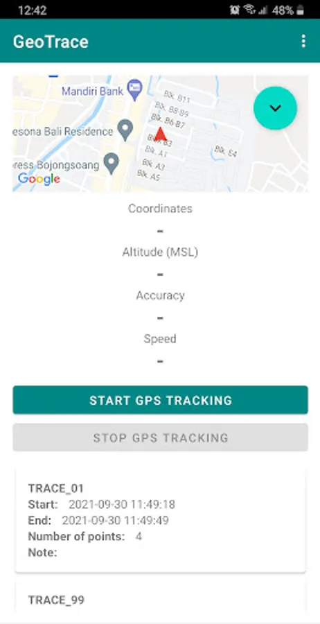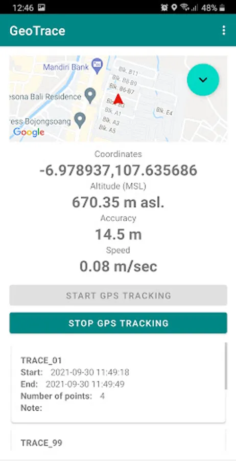 Simple scientific application to record, tracking or tracing coordinates using builtin GPS on your mobile phone. Unlike similar programs, GeoTrace records routes and tracking your coordinates in a variety of coordinate reference systems and can be exported to CSV, DXF, KML, GPX formats for advanced analysis.