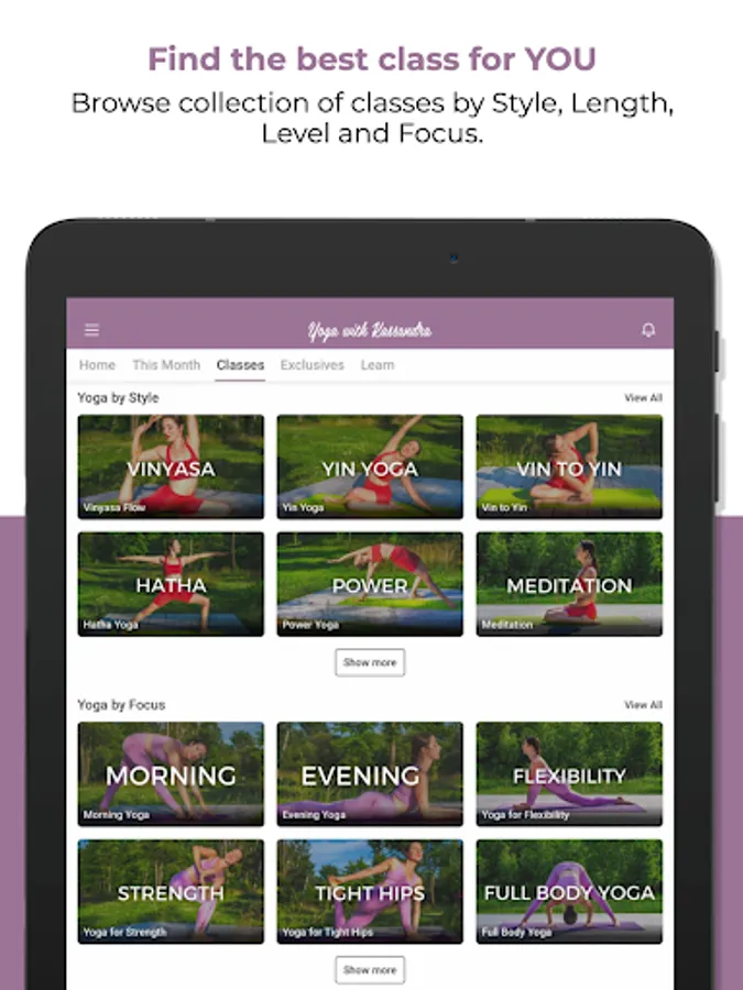 The Yoga with Kassandra app is your source for online Yin & Vinyasa Yoga classes. Members get access to over 750+ videos that can be streamed or downloaded for offline use to any device!