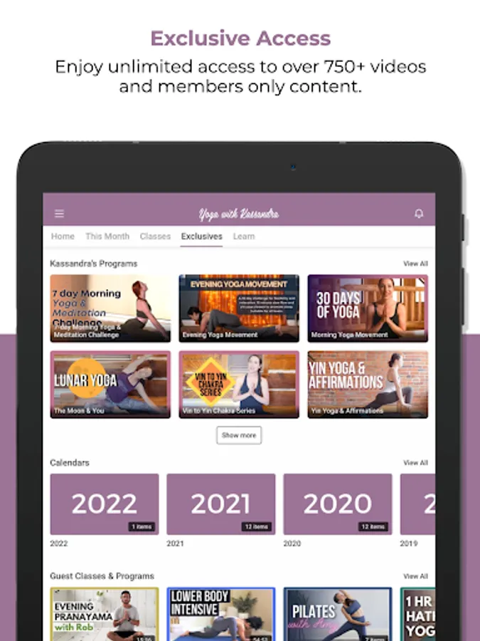 Enjoy the collection of classes from the Yoga with Kassandra YouTube library as well as exclusive members-only classes, monthly calendars and programs. New exclusive classes, programs and monthly calendars are added every month. You can't find those anywhere else!
