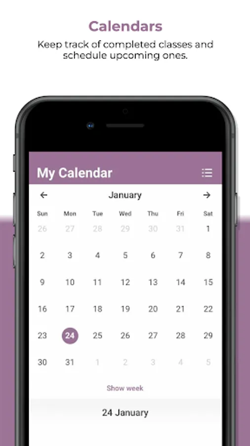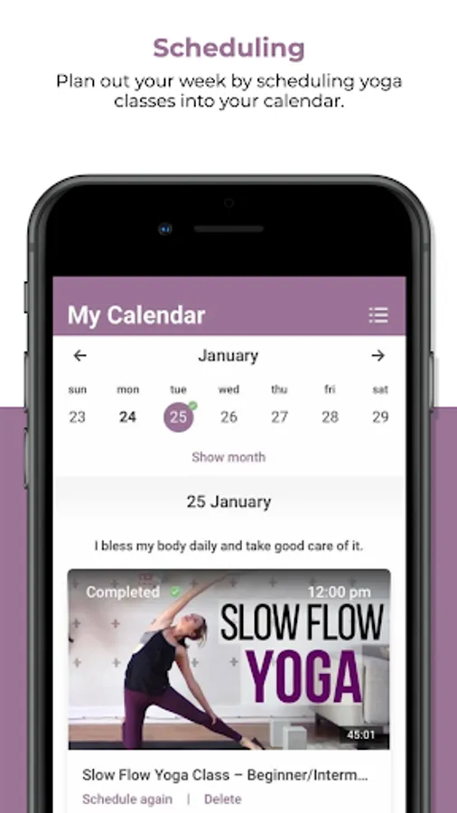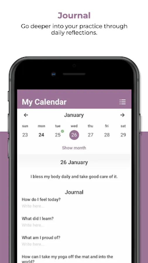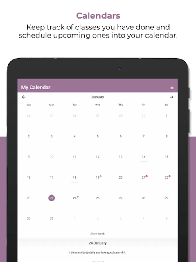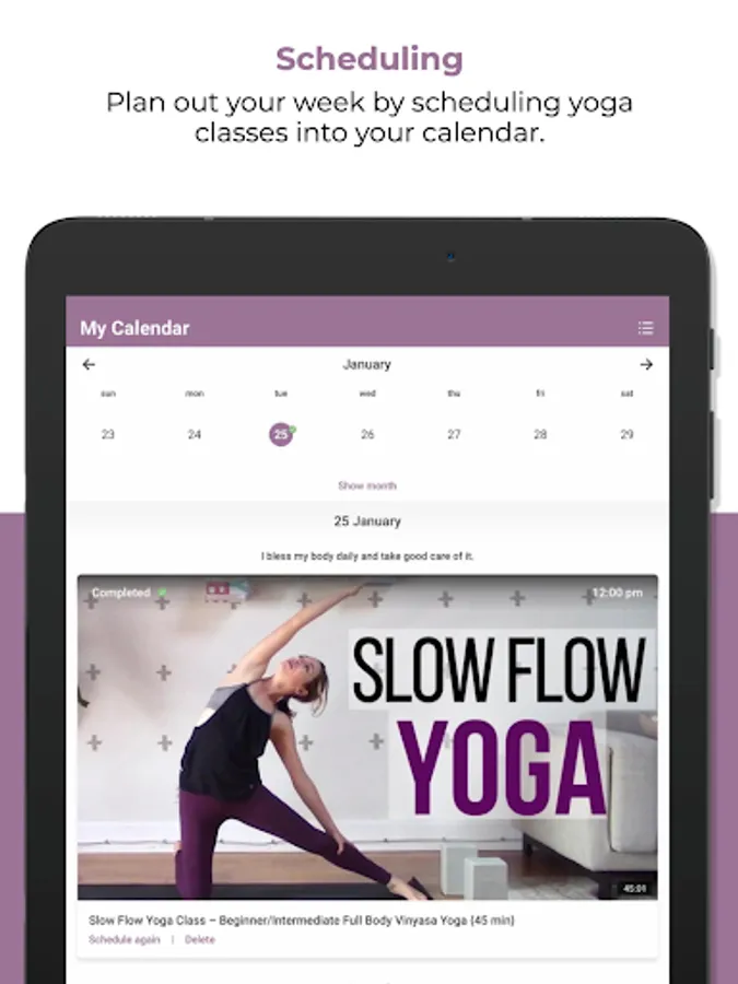 The in-app calendar allows you to schedule your yoga classes ahead of time and stay accountable throughout the week! When you do a yoga class it will automatically log it in your calendar so you can track your progress and reach your goals.