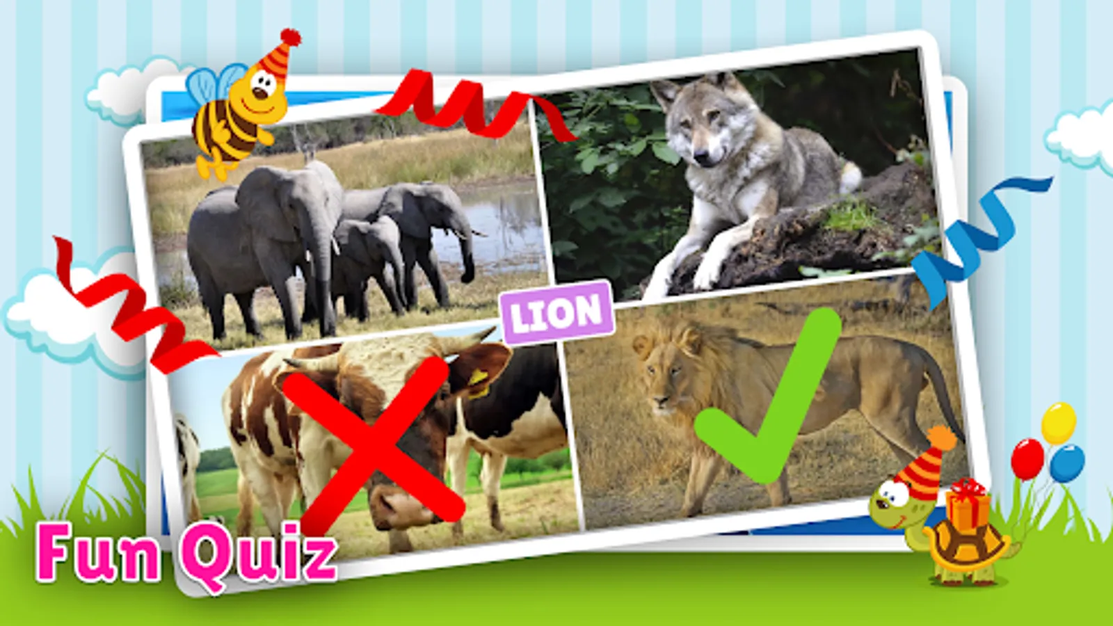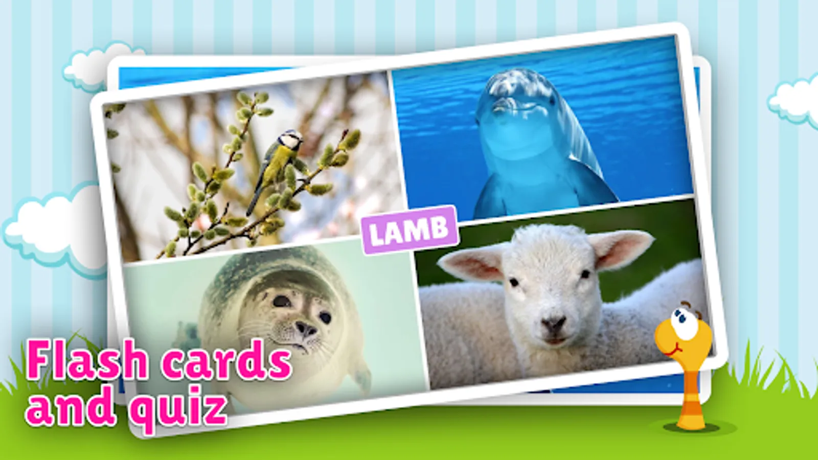 Does your child love animals? Here is a great fun educational game for kids and toddlers to learn about animals, their names and their sounds. Enjoy beautiful animal images in flash card style game play where cards with animals are shown. When you have learned some animals, try out the quiz part of the game where you are presented with 4 animals and 1 of them is correct.