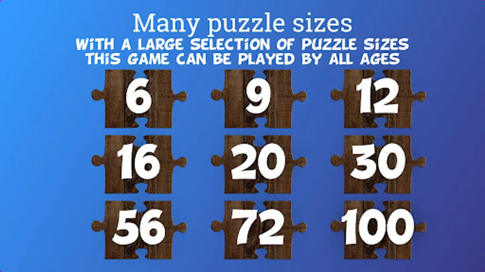- Challenge yourself with 9 different puzzle sizes - 6, 9, 12 or 16, 20, 30, 56, 72 and 100 pieces and 3 different puzzle backgrounds