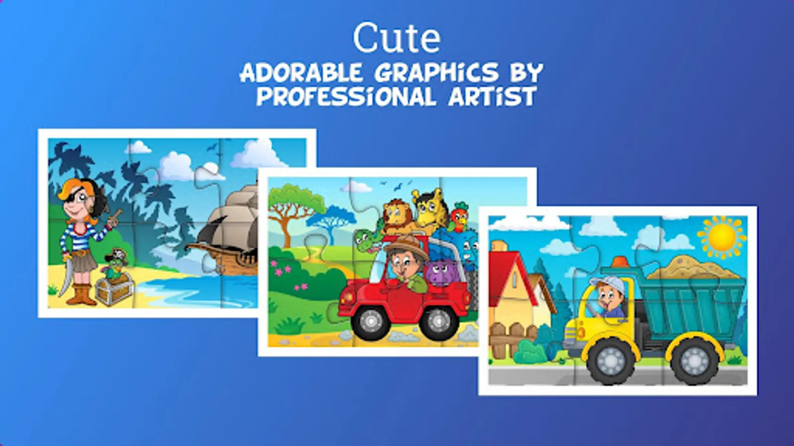 Many adorable puzzle scenes drawn by a professional cartoon artist with themes like: animals, life on the farm, the circus, birthday celebrations, fairytales, pirates, the ocean, vehicles like tractor and fire trucks and so much more! For each completed puzzle there´s a fun surprise!