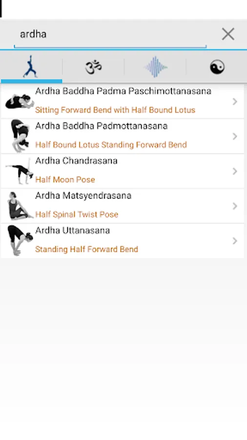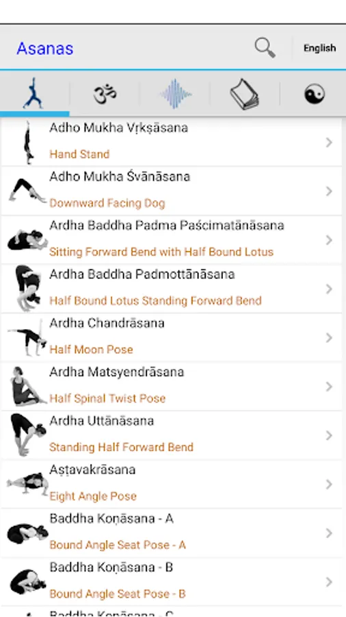 - Search for poses in English and Sanskrit.