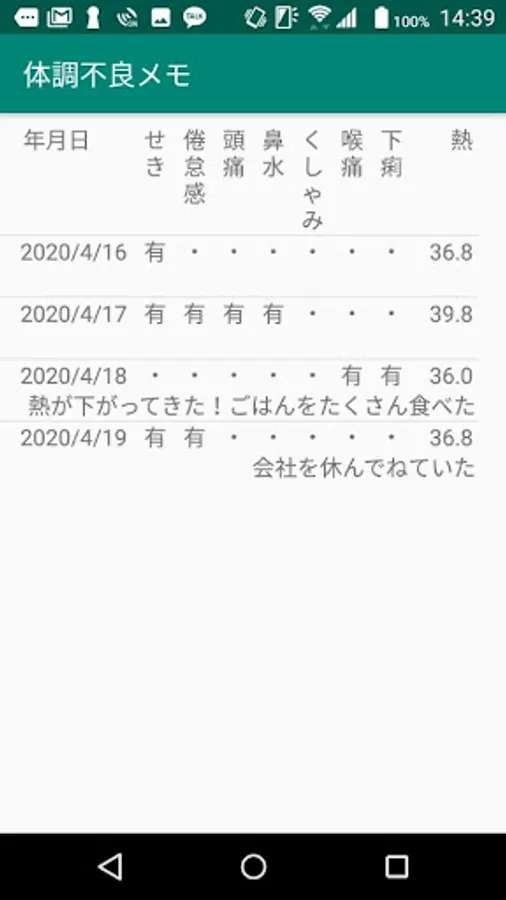 よくある風邪の症状として、せき、倦怠感、頭痛、鼻水、くしゃみ、のどの痛み、下痢、体温について、その症状があったかどうかにより、日付ごとにチェックを入れたり、体温の入力などをしておきます。履歴を見ると、いつごろから、どのような症状が出たかを一覧で表示できます。