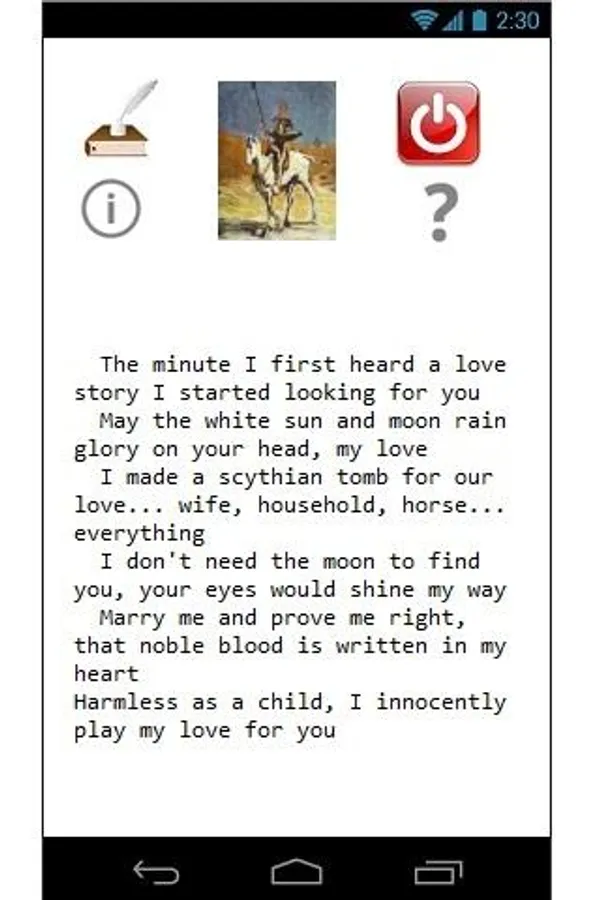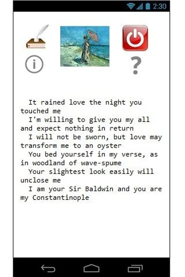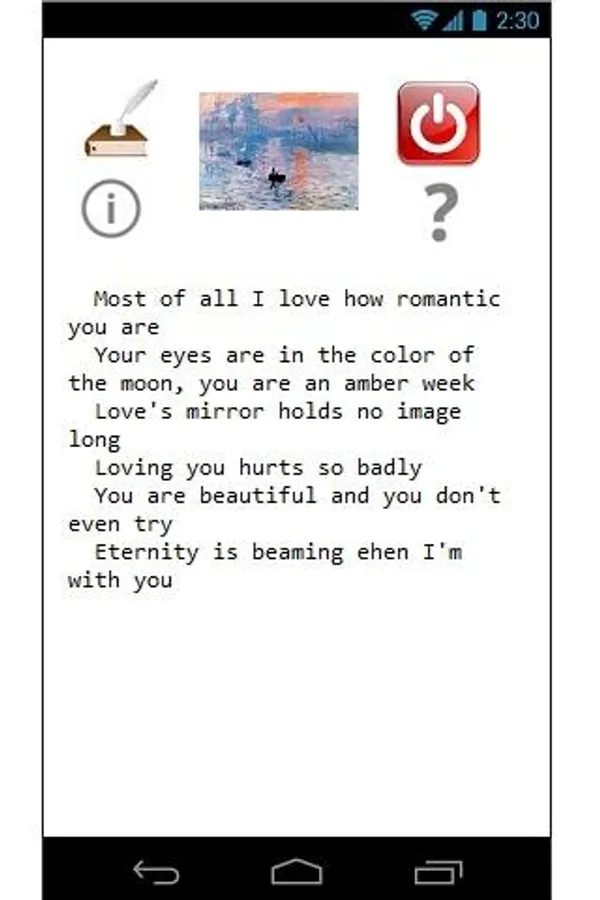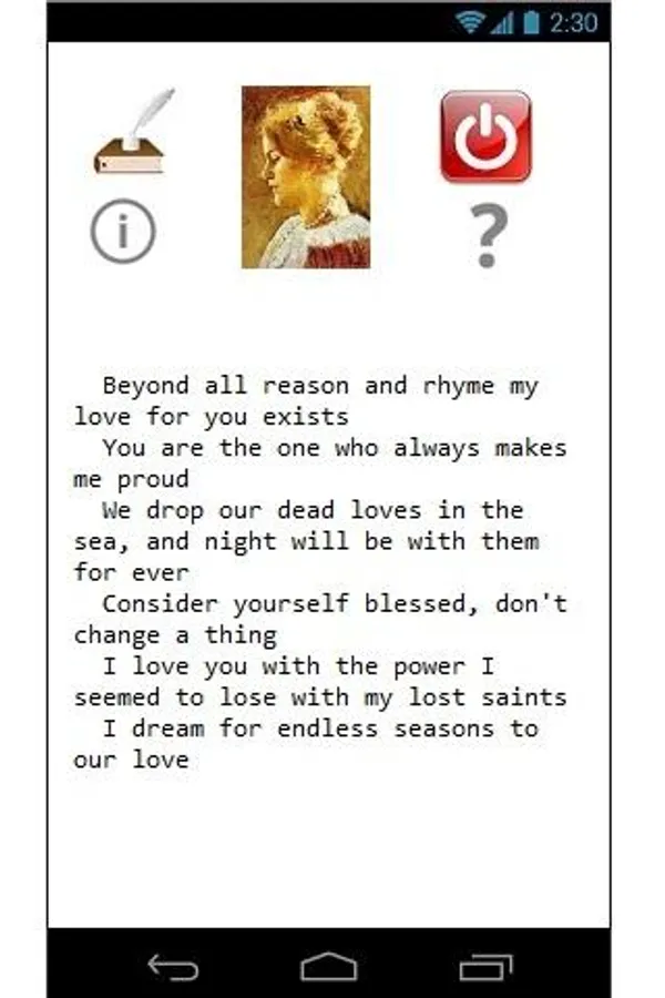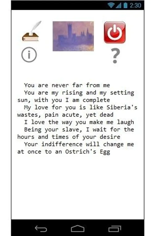 Android In Love is a florilegium of love words, selected from the World's Literature (Internet sources). Use it to compose love songs and messages for your love friend, or to refine your English language.