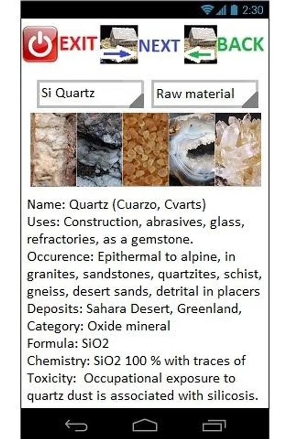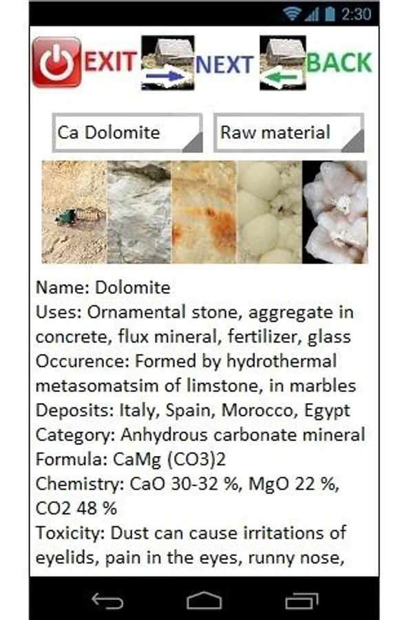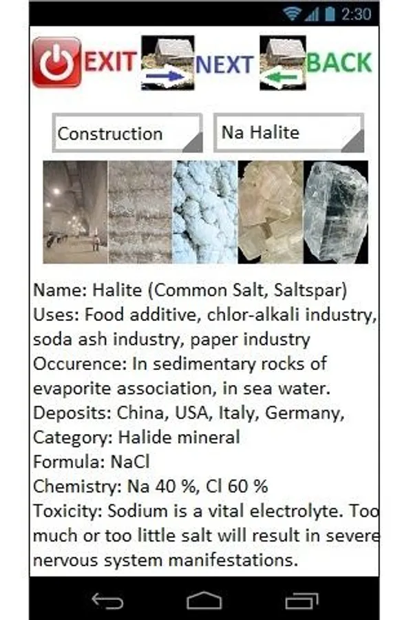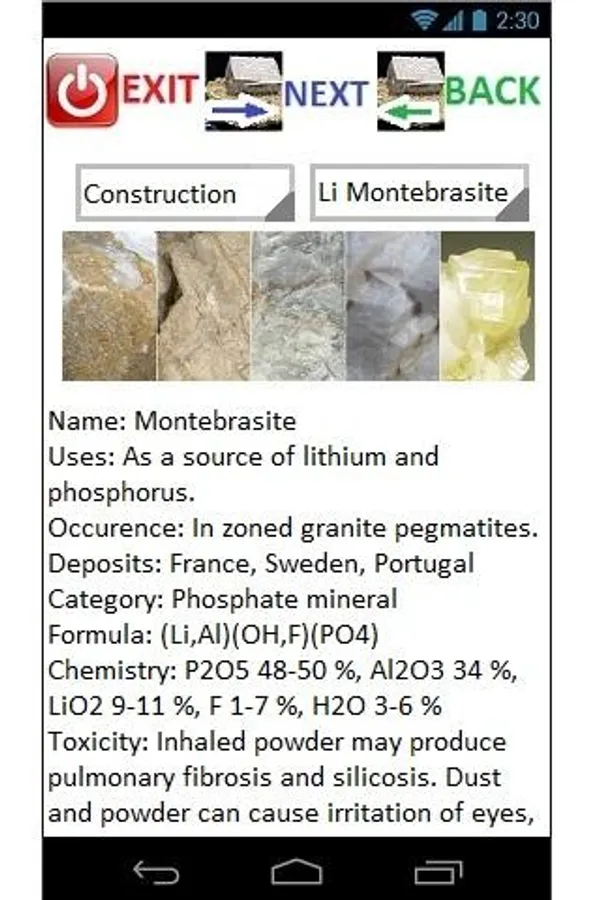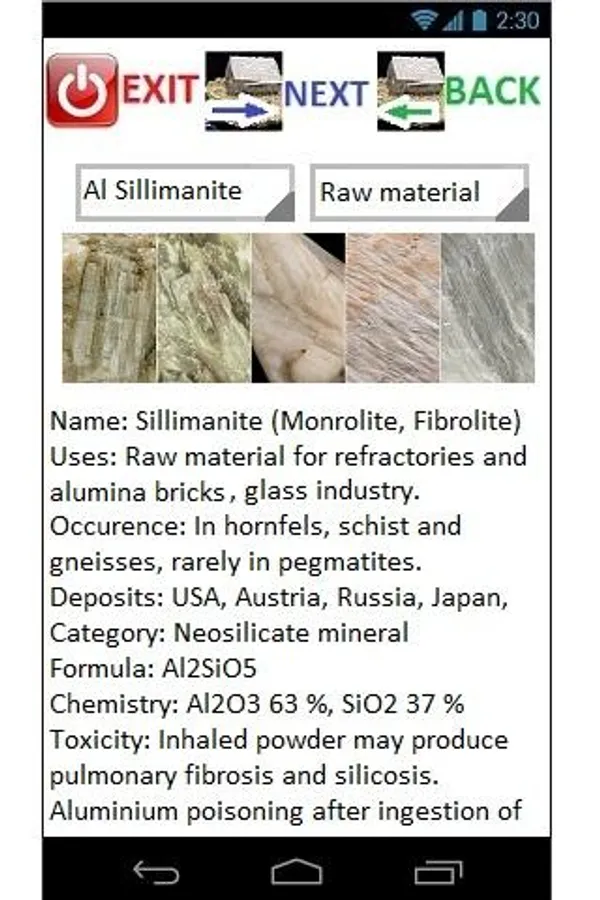 A short description for 120 common minerals used in industry, for construction or as raw materials. The description includes the toxicity of their components. Works regardless the network connection.
