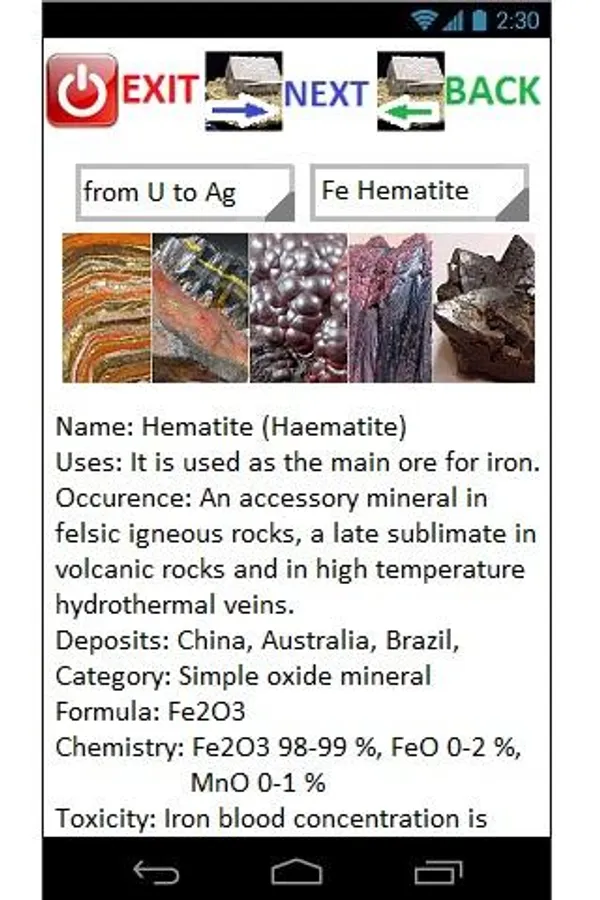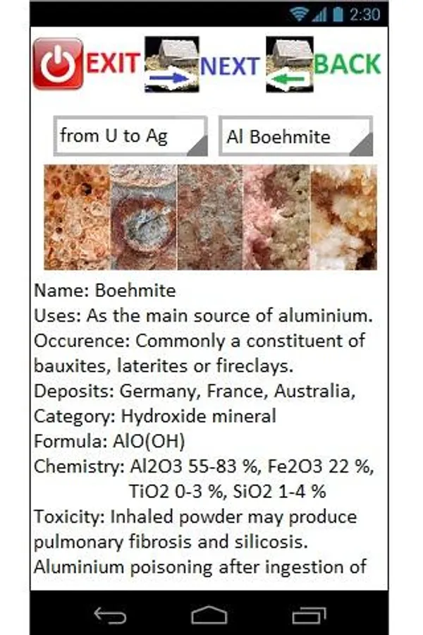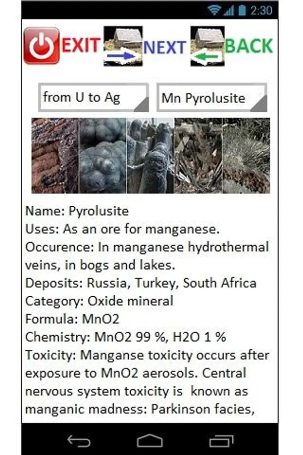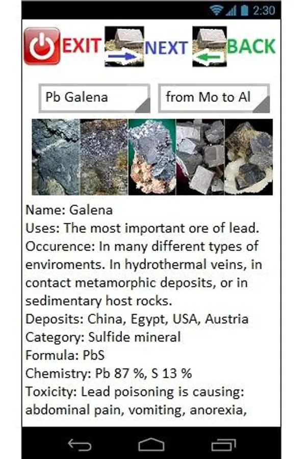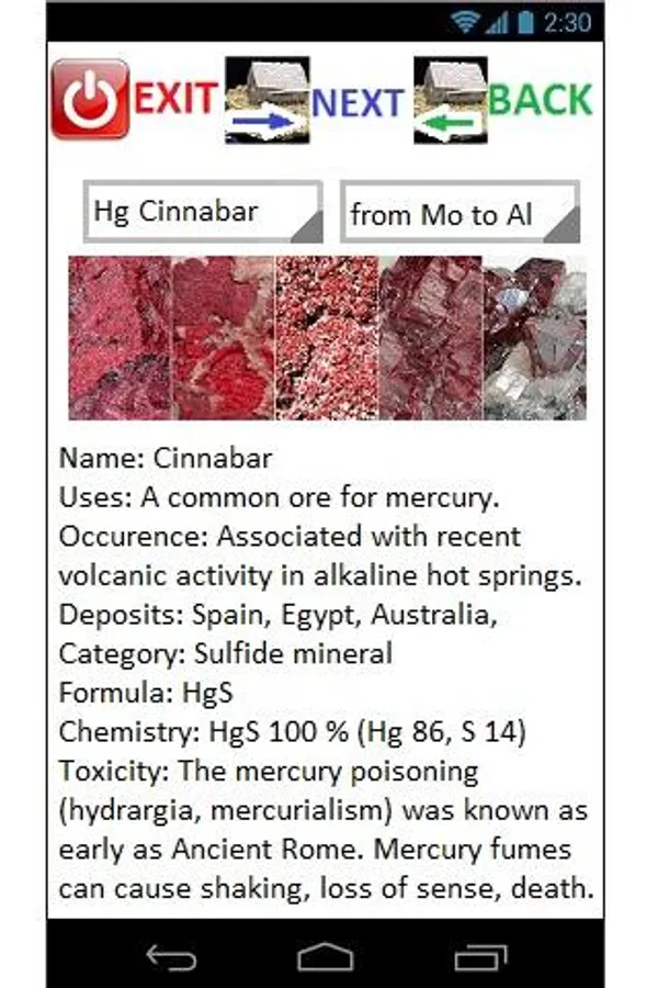 This application present 133 minerals, the most common ores for metals. Collecting minerals may pose a very serious hazard to you and your family. Toxicity of the components and the main hazards for each mineral are included. Works regardless the network connection.