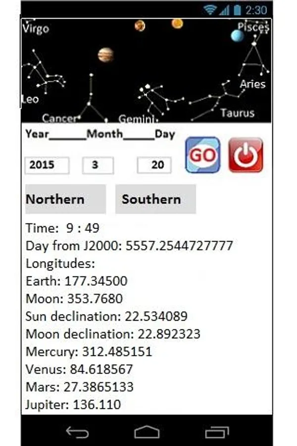 This application offers you a diagram for the relative positions of the Solar System Planets and some maps with the night sky constellations.