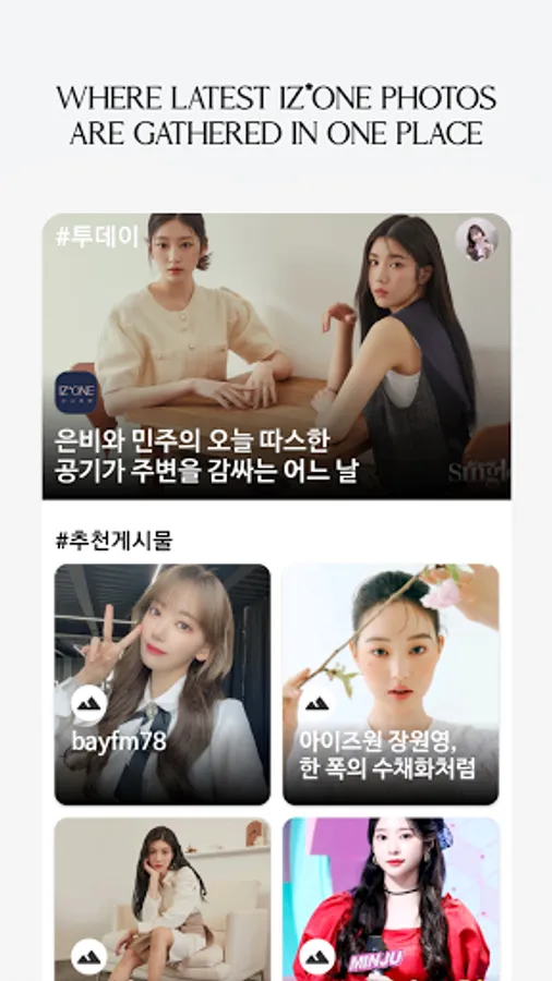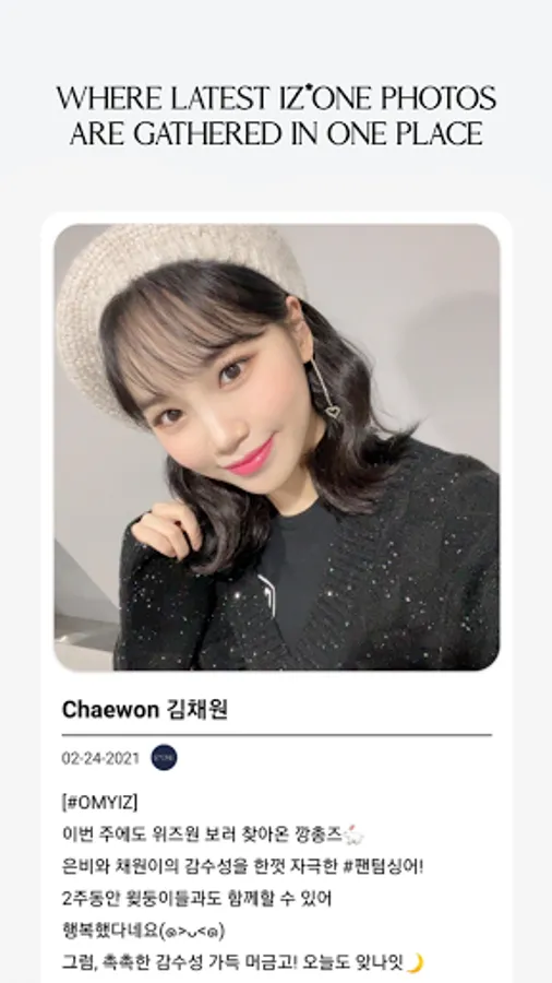 IZONE GALLERY*IZ is an application where you can explore the latest IZONE photos that are updated periodically! This app is designed for WIZONE who wants to explore the latest of IZONE.