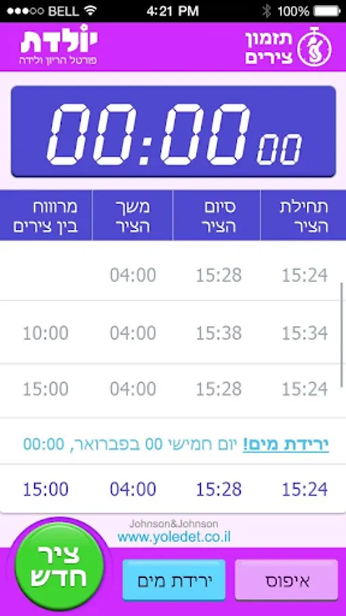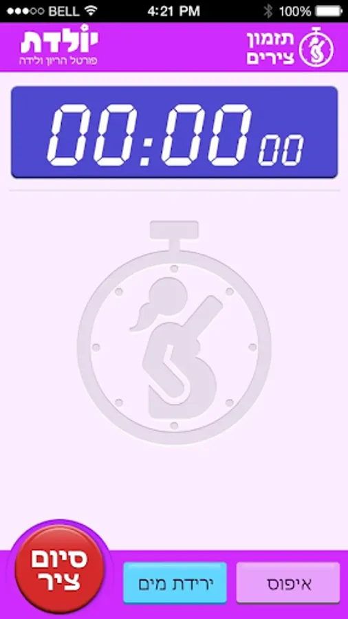 מרכז סיכום עבור תהליך הלידה המחלדה וההריון הכולל טיימר לחישוב תזמון הצירים וזמן ירידת המים.