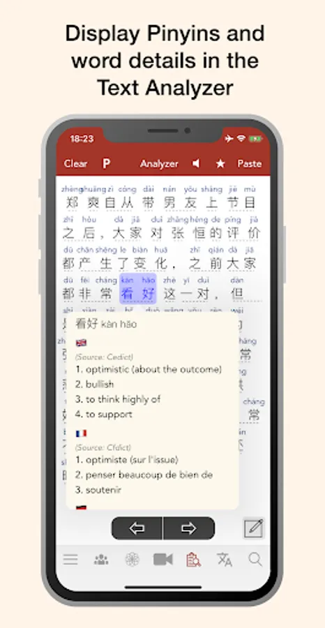 • Paste some text, or import it from the OCR modes, into the text analyzer to get definitions of each word in the text