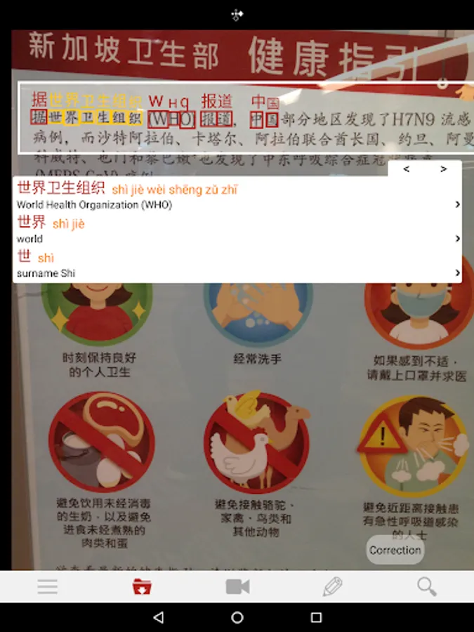 Chinese text is detected, recognized and parsed into words in a fraction of a second. Detailed information of each word and Chinese character is then provided such as their pronunciation and their definition in English.