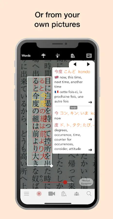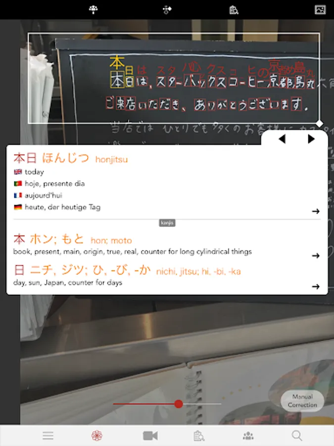 Yomiwa also features powerful, fast and offline Optical Character Recognition (OCR) technology. Yomiwa can recognize more than 4000 Japanese characters in your pictures or with your device camera. Japanese text is detected, recognized and parsed into words in a fraction of a second.