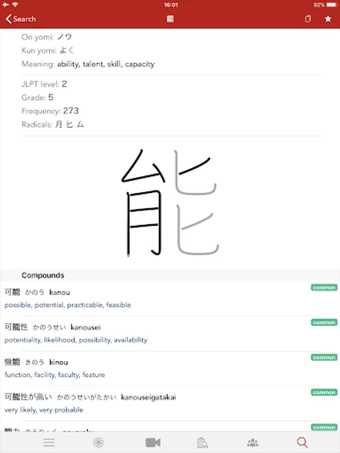 • Complete information about Japanese words and Kanjis such as on-yomi, kun-yomi, meaning, stroke order, compounds etc.