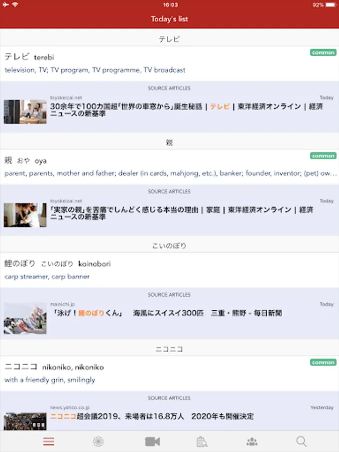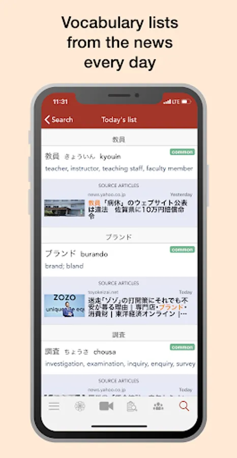 • Keywords appearing in the daily news are displayed in the app everyday. You can open the source news article and add Furiganas in order to read it with ease