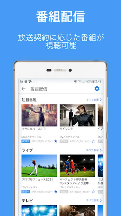You can enjoy sports such as baseball and soccer, live music, live stage performances, and video works such as movies, dramas, variety shows, and animations. (This applies to channels and programs that can be viewed as "broadcast subscribers free of charge". To view, you need to log in with your My SKY PerfecTV! ID.)