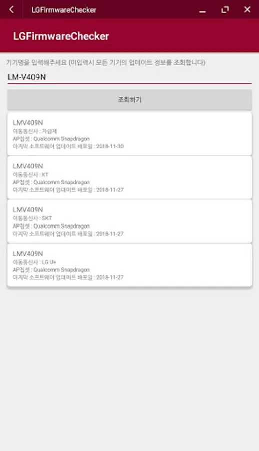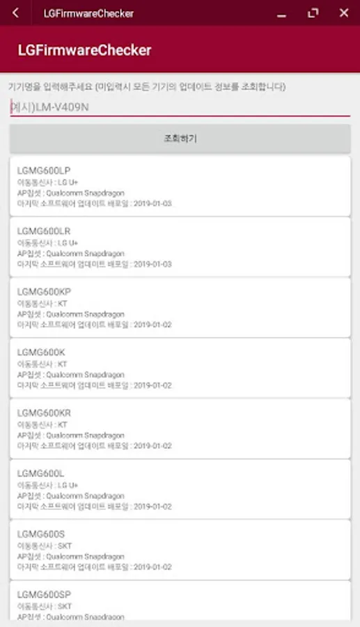 Check All LG Devices' information or filter with Device Code like LM-V409N