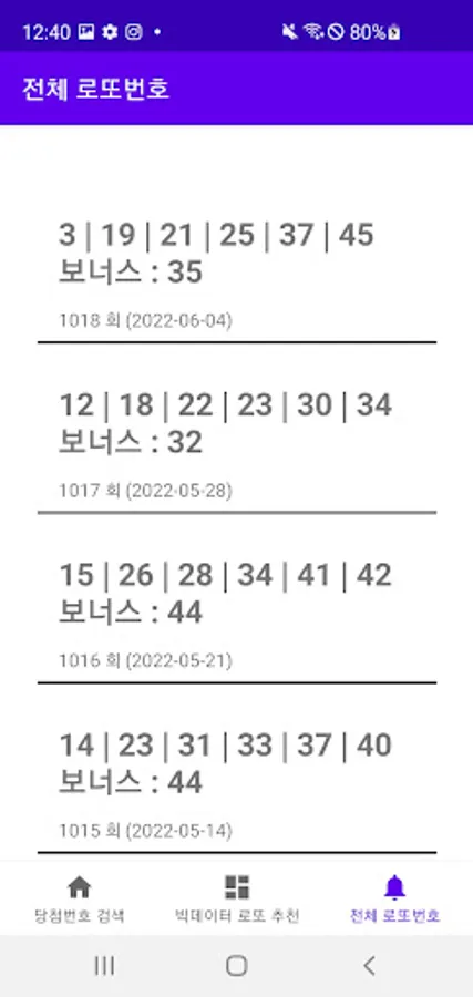 Lotto winning numbers for each round,