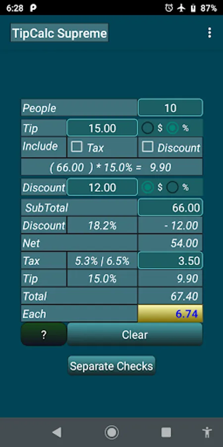 This tip calculator allows you to set a default tip percent, as well as whether to include the tax in the tip calculation.