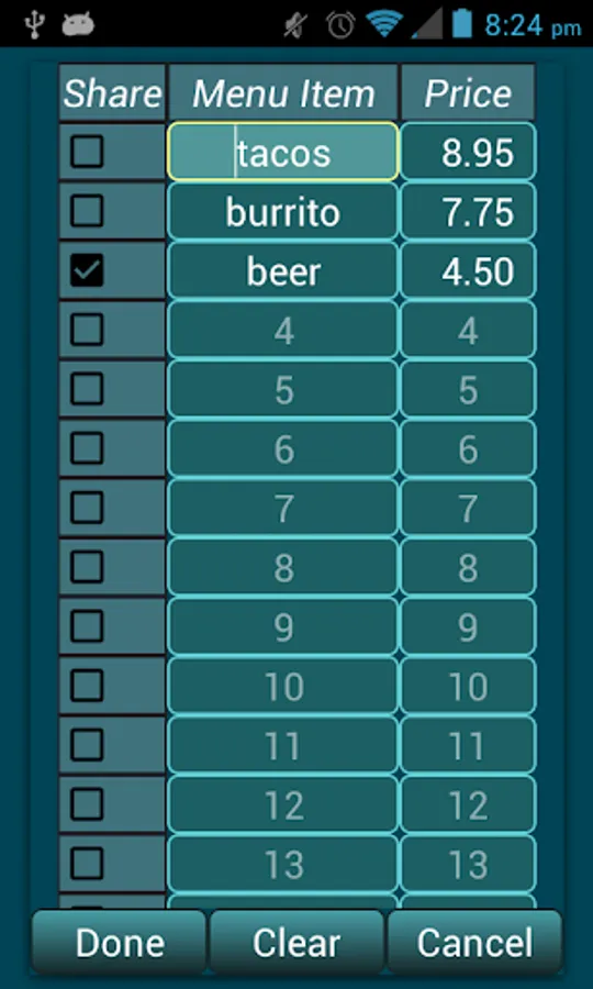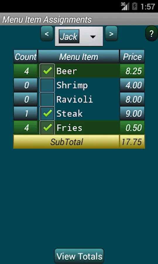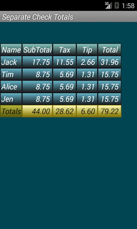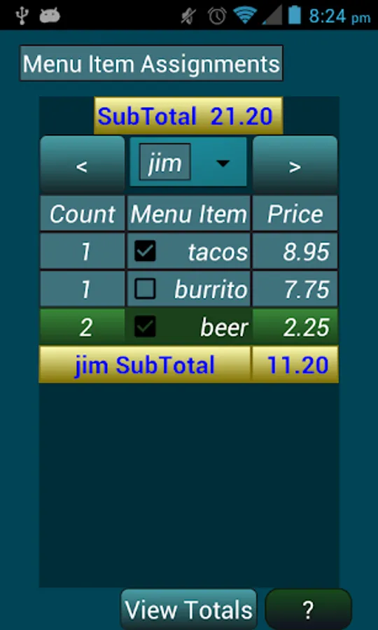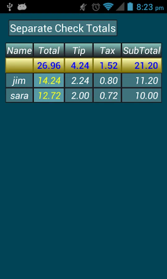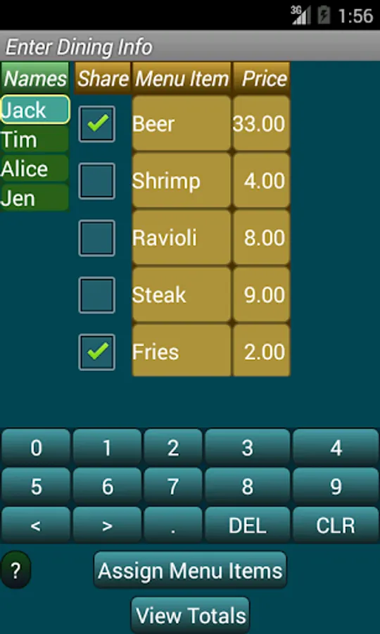 Enter the subtotal, total tax, tip in percent, menu item names and prices, and optional peoples names, then assign menu items to each person and the tip calculator displays each person's individual bill. You can also set menu items as shared, and the cost is split equally.