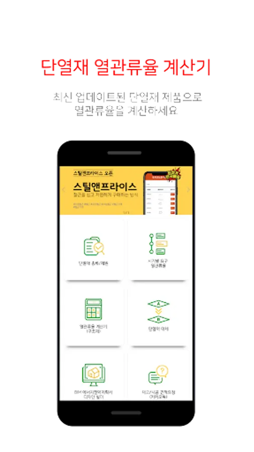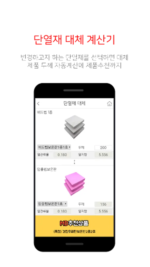 : 원본 단열재의 제품과 두께를 입력하면 비교하고자 하는 단열재의 두께, 열관류율, 열저항이 자동으로 계산. 또한 앱에서 최적의 상품을 추천하여 고객이 손쉽게 구매 가능(전화 및 카카오톡 문의)