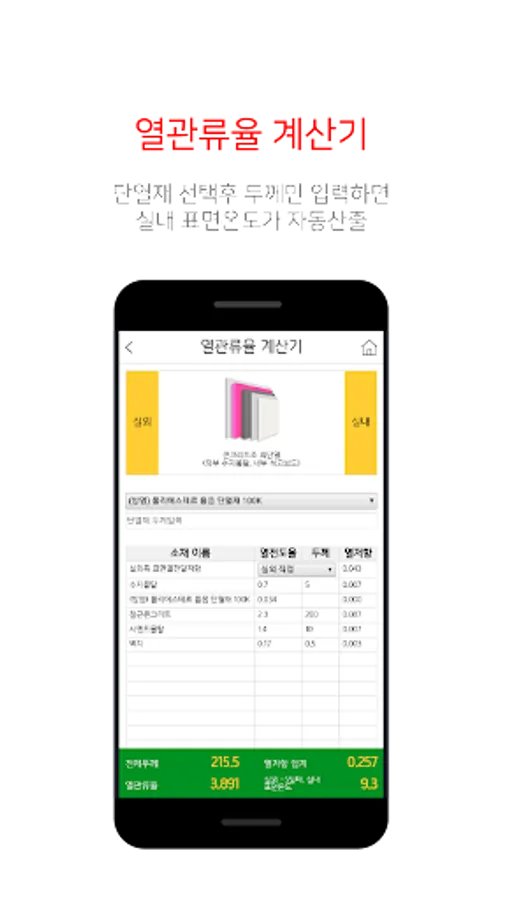 : 약 20종류의 벽체에 '단열재 종류 및 두께 입력' 시 자동으로 구조체의 전체두께, 열저항 합계, 열관류율, 실내 표면온도 계산