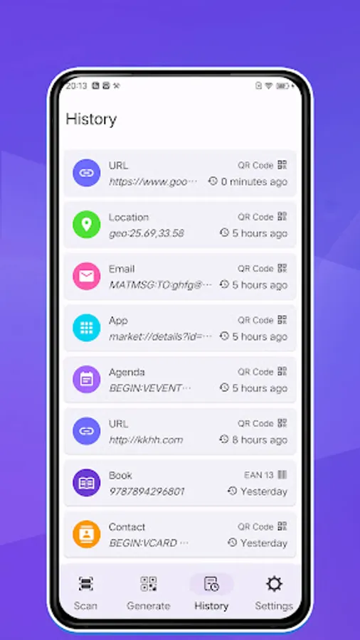 QrCodeBox can scan and read all types of QR codes, including text, urls, products, contacts, ISBNs, calendars, emails, locations, Wi-Fi, and many other formats. After scanning, the user is only provided with the relevant options of the personal QR or barcode type and can take appropriate measures.