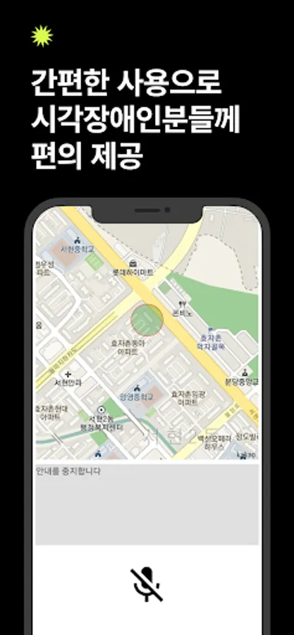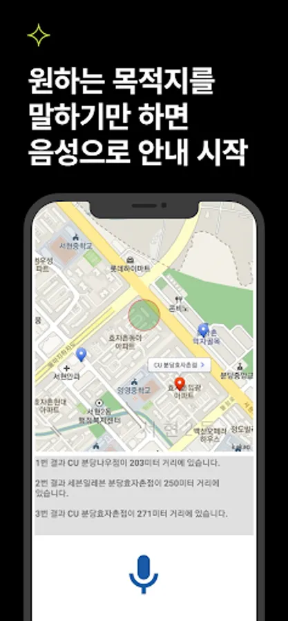 소통방식으로 이루어진 시각장애인분들께 최적화된 네비게이션 앱 입니다. 자신이 원하는 목적지를 얘기만 한다면 현재 위치에 가장 가까운 3개의 장소들을 음성으로 전달 됩니다. 이 앱을 시작으로 많은 분들이 시각장애인분들께 더 많은 관심을 가지고 더 나은 기술이 개발되길 바랍니다.