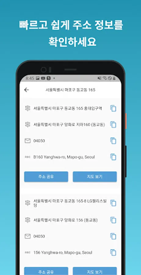 1. "Road name address" 2. "Lot number address" 3. "English address" 4. "Zip code".