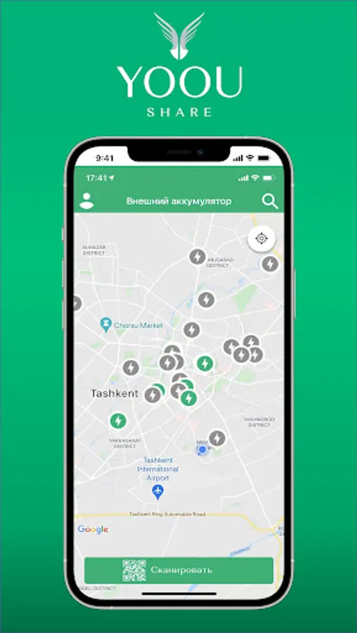 The YOOU app offers safe and secure payment methods. Just pay 500 sum for 30 minutes of rent. Payment by bank cards, Payme, Apelsin, Click, Oson. YOOU is now available everywhere with a fully charged battery and it costs less than your own battery, only pay when you need it.