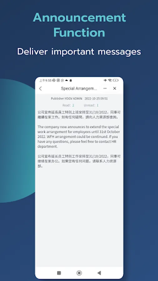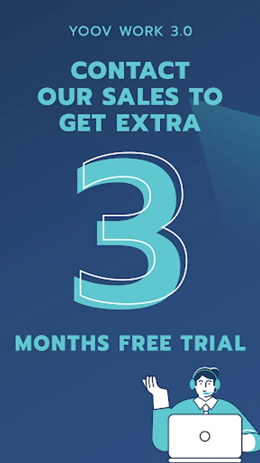 You can have a 14-day free trial of our mobile app. You can have a 14-day free trial of our mobile app. After downloading YOOV WORK, please contact our customer service team via WhatsApp or phone, enjoy an extra 3 months Free trial!