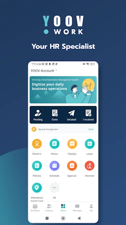 • Simply apply for the leave on YOOV WORK. Any adjustment and leave balance will be recorded on the calendar automatically by the system. You can check out the leave record anytime.