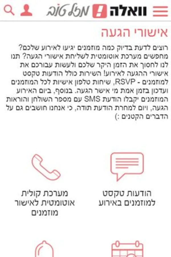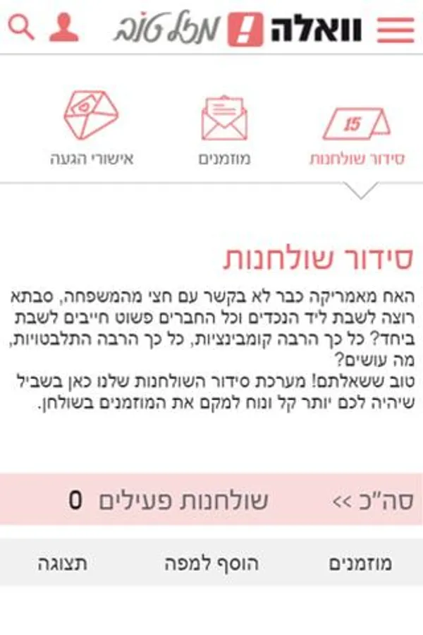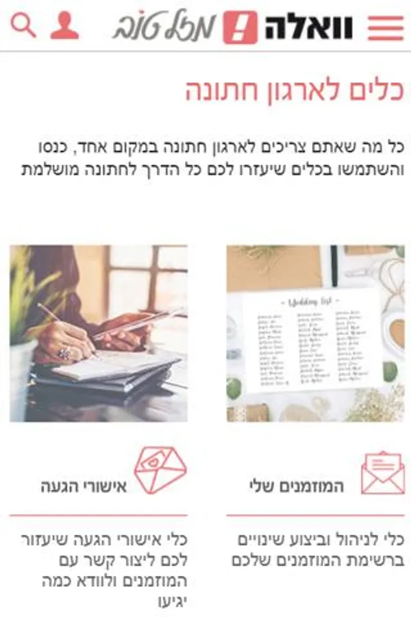 Planning a Wedding / Bar Mitzvah / Bachelorette Party? At Walla Mazal Tov we have created for you an advanced system that will accompany you all the way to the perfect event. How It Works? All the important information and all the most innovative tools for managing your event are just one click away - all easily and for free.
