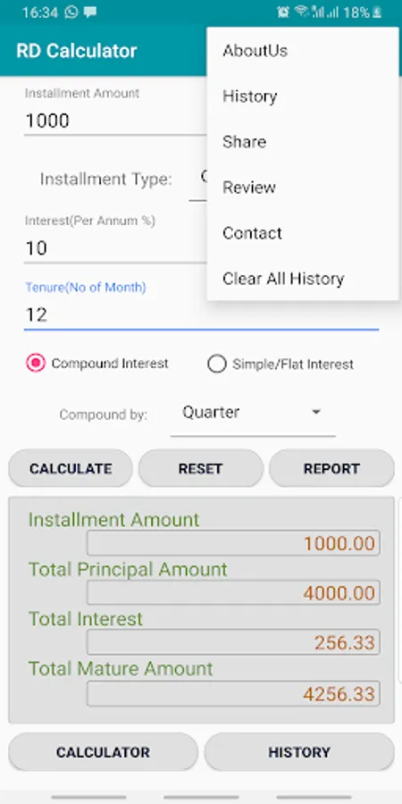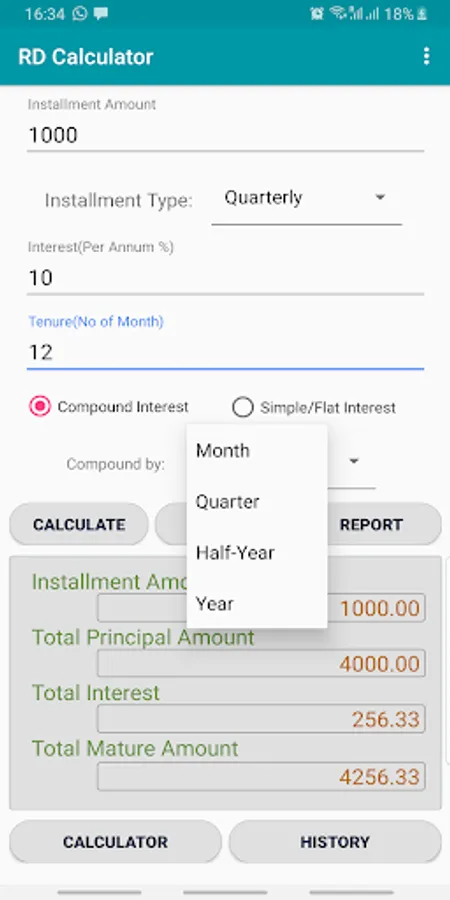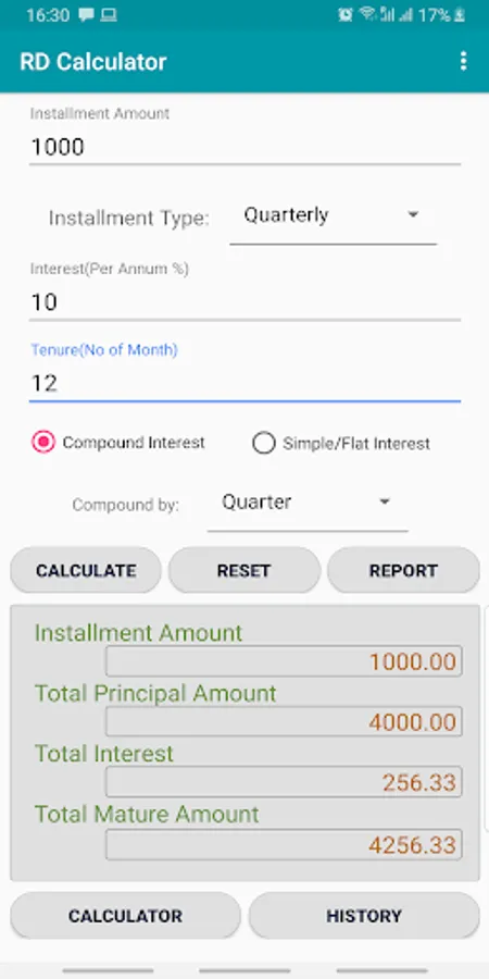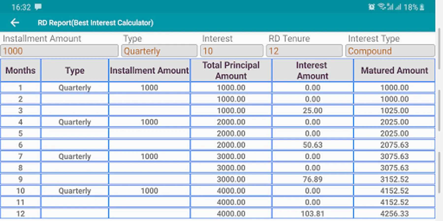 RD Calculator used for calculating interest amount for recurring deposit with different installment type like monthly, quarterly, half year and yearly. It also helps to find simple and compound interest with different compounding frequency.