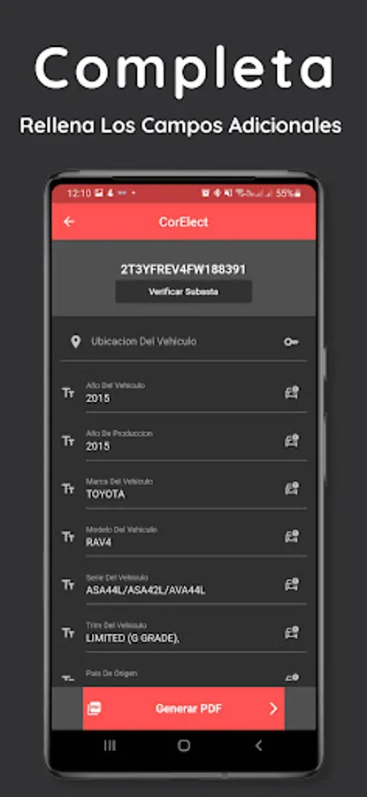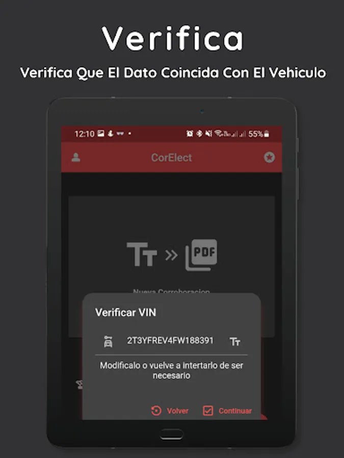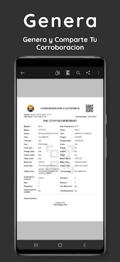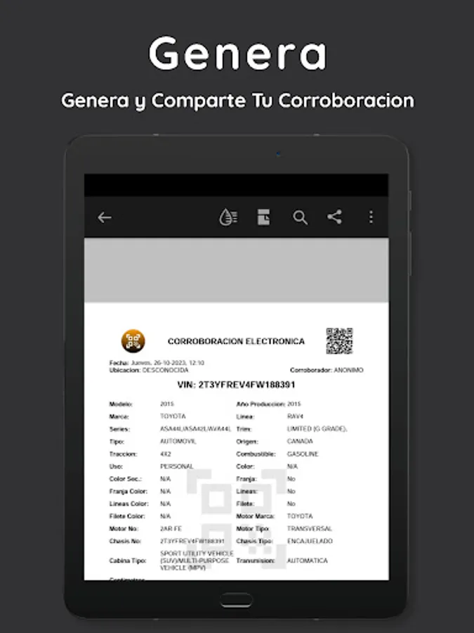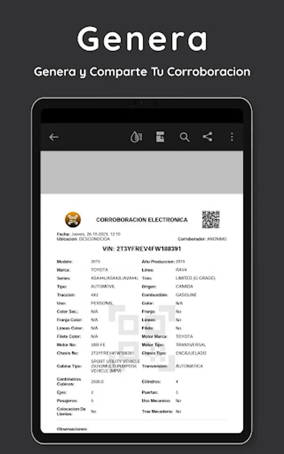 Scan the QR or BARCODE code on the sticker of your vehicle to begin the corroboration, the application scanner reads* the vehicle's VIN and with this decodes it, with this data preloaded in your corroboration, all that remains is to fill in the missing data and verify those that are already there, and with a simple bot you generate the PDF of your electronic corroboration.