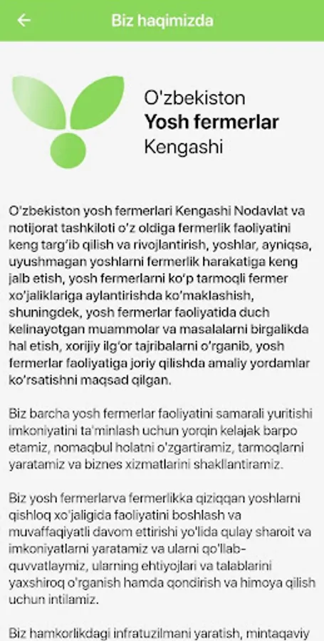 Biz yosh fermerlar bilan birga mamlakatimizda oziq-ovqat barqarorligini ta'minlash yo'lida ocharchilikka, ishsizlikka, iqlim o'zgarishi, ekologik muammolarga qarshi kurashish hamda qishloq joylarida gender tengligini ta'minlash yo'lida faoliyat olib boramiz!