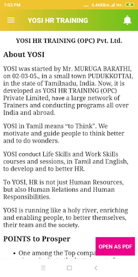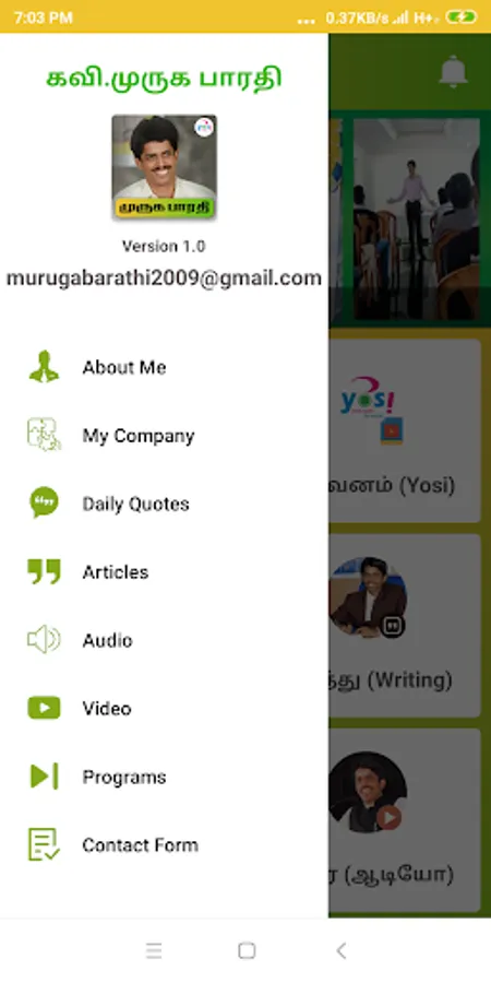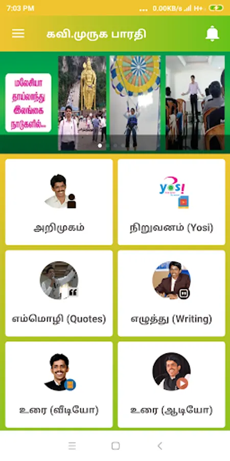 Connect with Murugabarathi and his company – YOSI – on your mobile with the official MURUGABARATHI app! Through automatic notifications, you can read the latest articles by Murugabarathi, listen to his speeches as audio and watch the newest videos on topics ranging from Happiness to Development, Relationships to Teamwork, Success as a person to Success in Profession, Personality Development to Business Development, Memory Techniques to Leadership Strategies, Character Building to Social Service, to live a valuable life with life values.