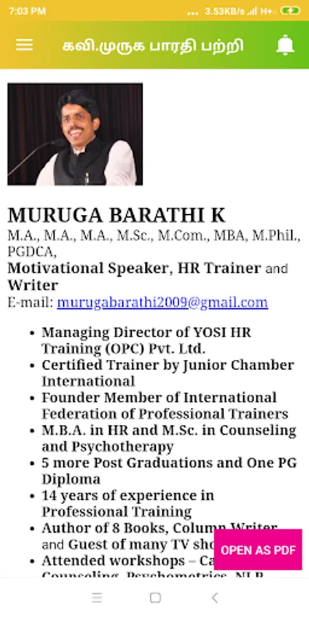 About - Learn more about Murugabarathi (Profile in Tamil and English)