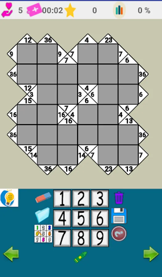 is looks a lot like crosswords, but with numbers instead of letters, a vertical or horizontal word consists of numbers between 1 and 9, a number does not repeat itself in a word, the sum of the number result of the word in column or line is equal to the number indicated in the triangles on the right or on the top .