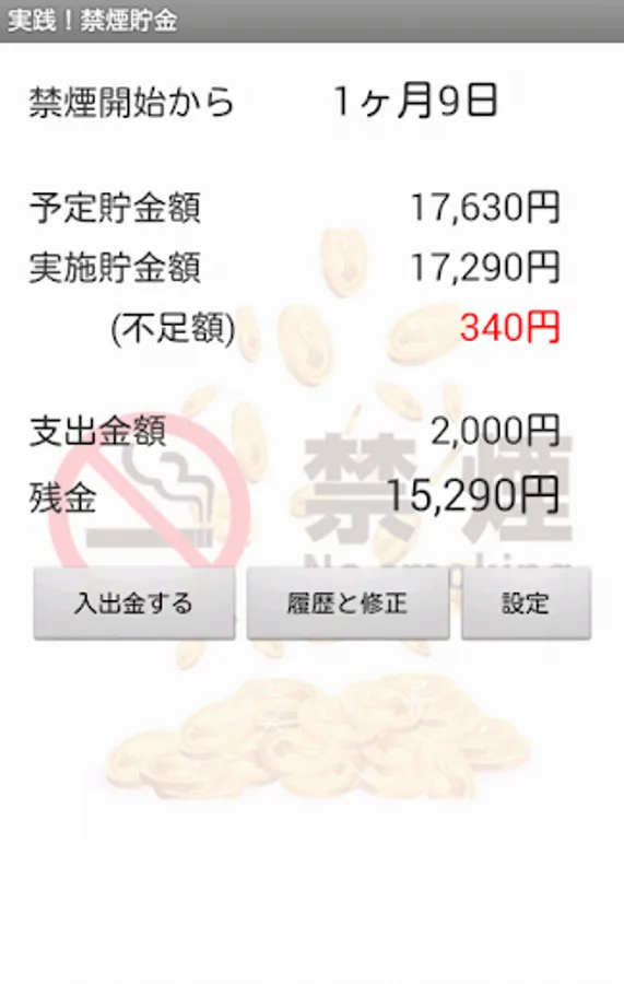 その日までの予定金額と実際に貯金した額が表示され、差額も表示されます。