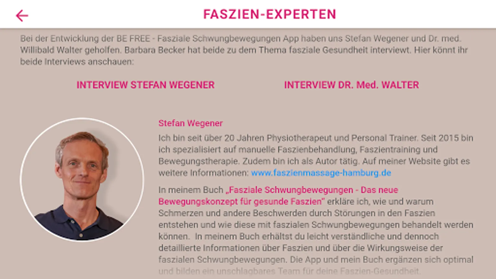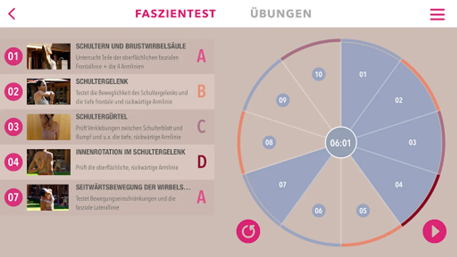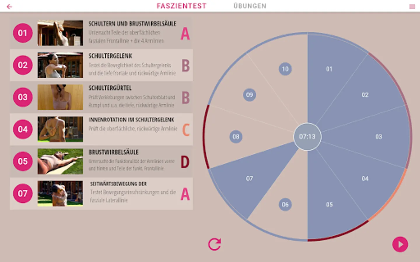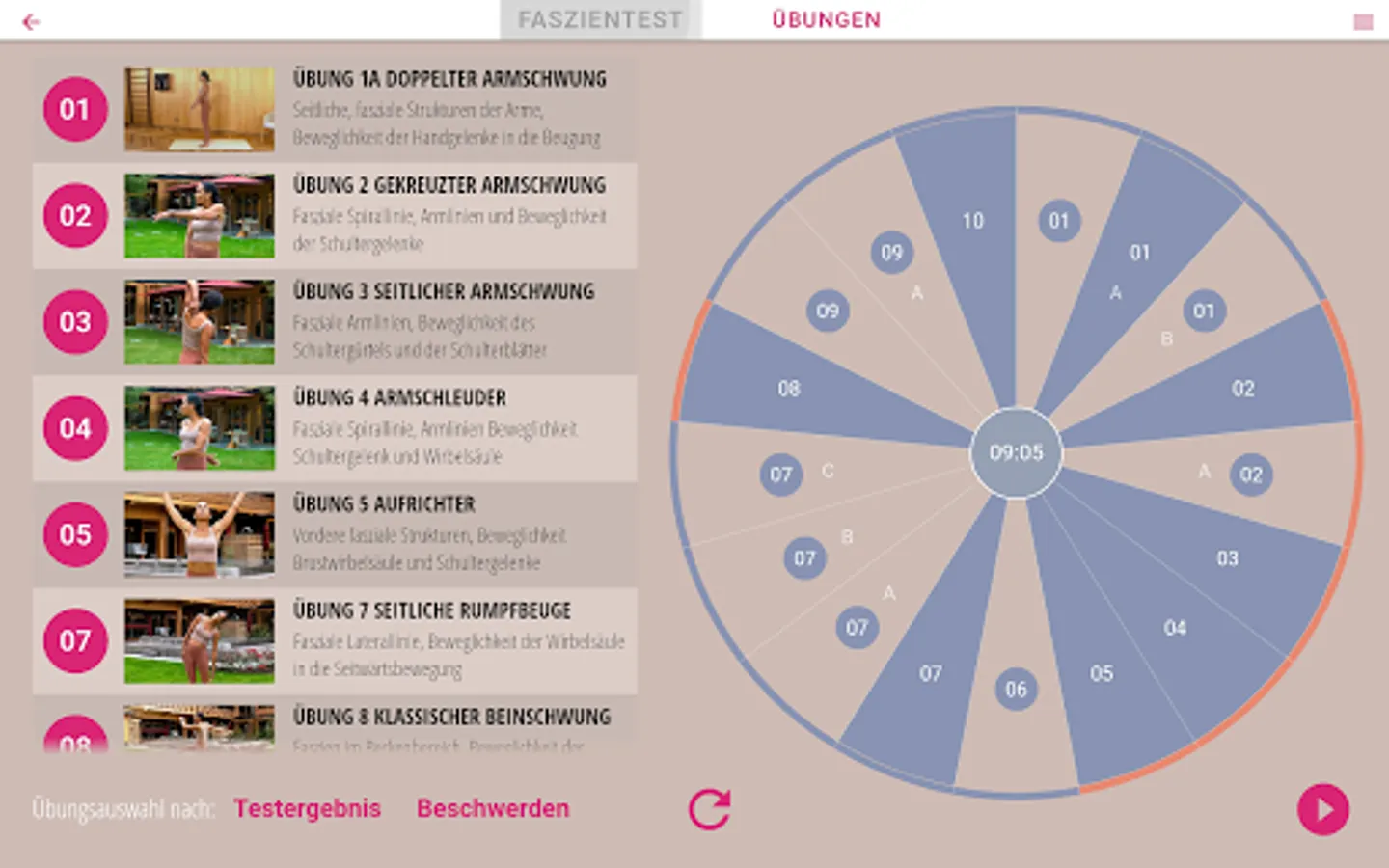 You can purchase all swing movements via the in-app purchase and have your individual training program put together according to the test results. It consists of exercises for your imbalances and other swing movements that maintain your fascia fitness. Alternatively, you can have the training tailored to your restrictions or complaints, such as headache or neck pain. The training lasts about 10 minutes and can be carried out anywhere.