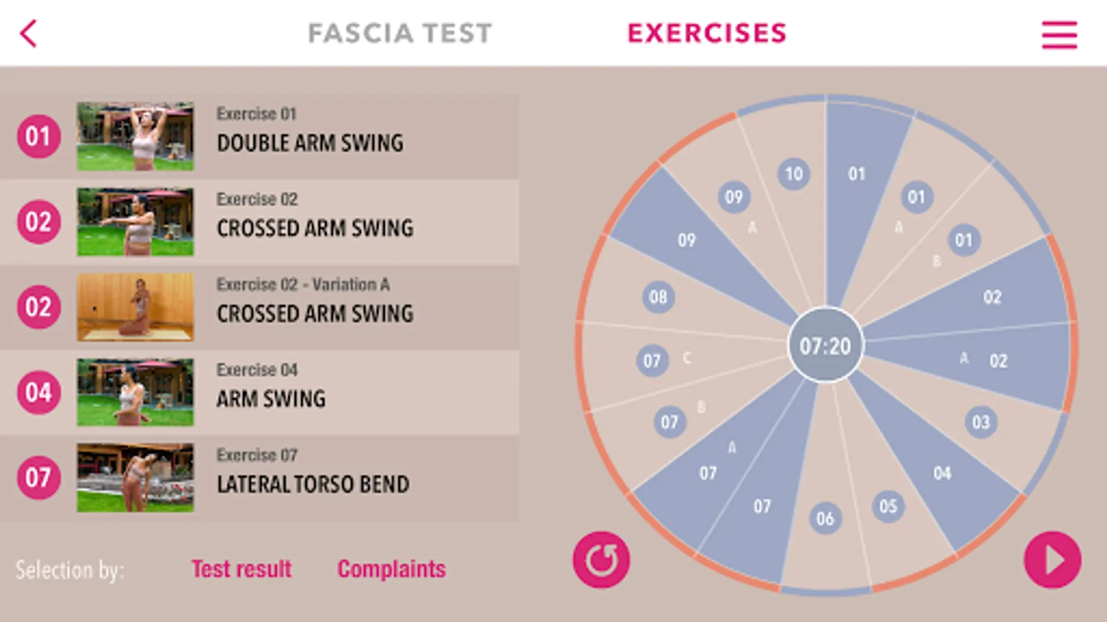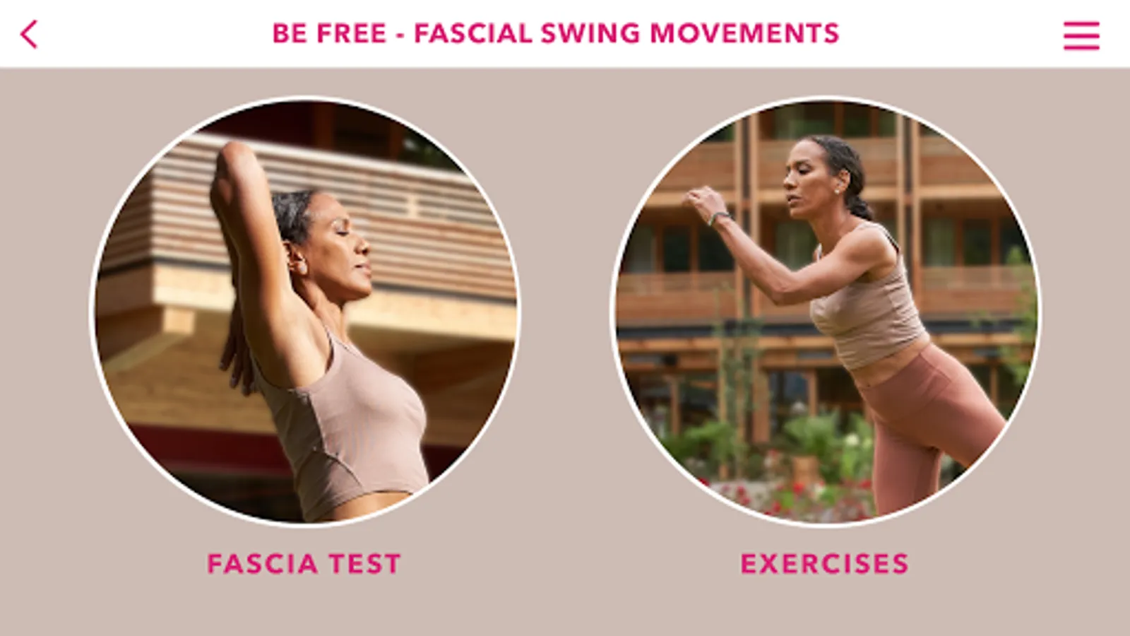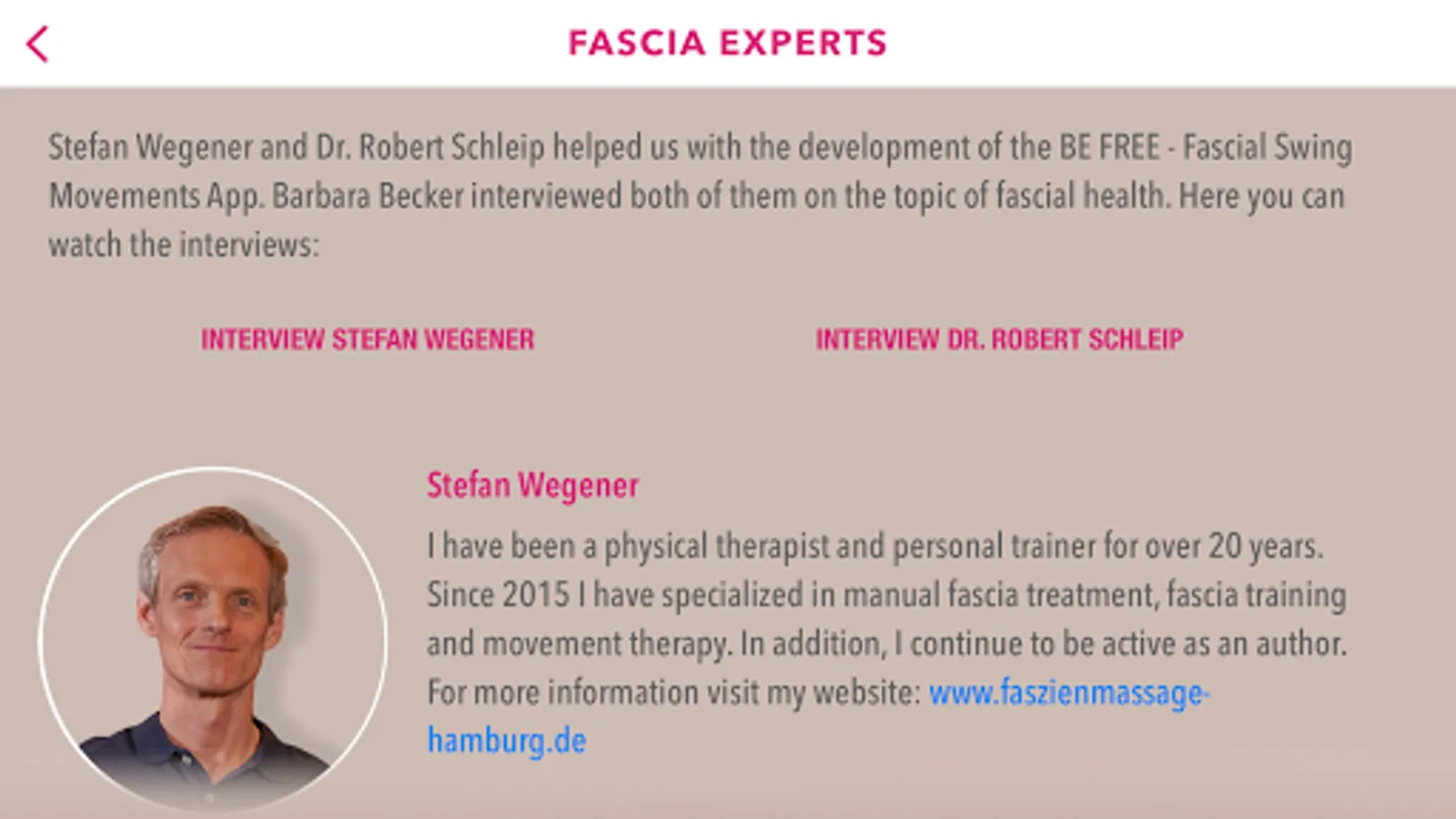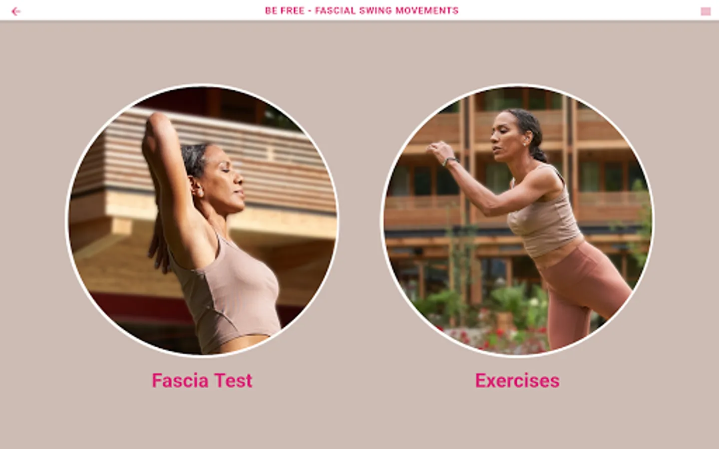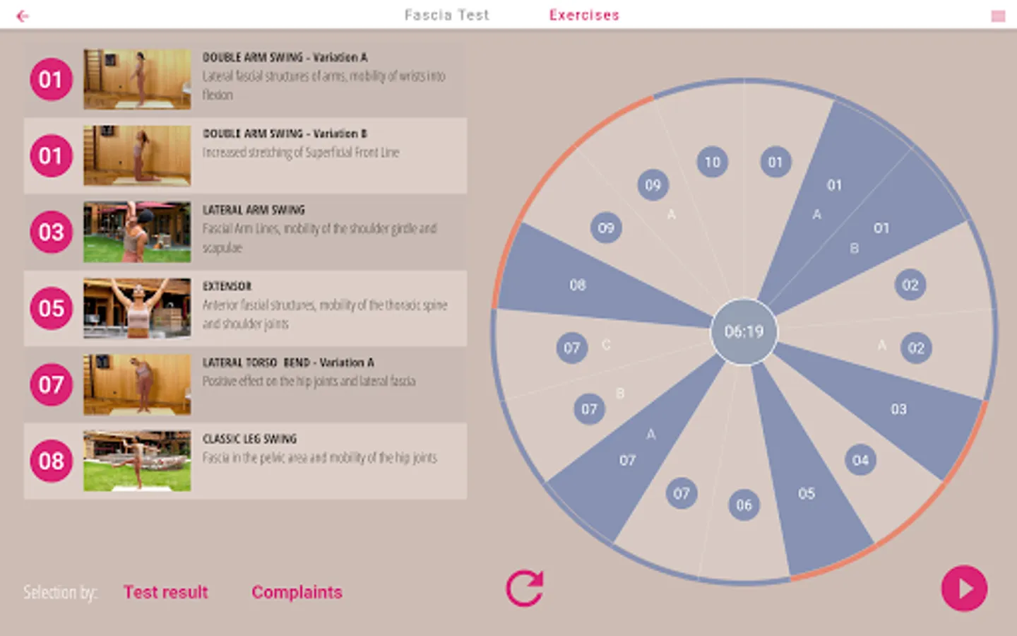The fascial swing movements can be acquired by In-App Purchase. Get your individual training mix according to the test results. It consists of exercises for your imbalances and further swing movements that help you in maintaining your fascial health and fitness. Alternatively, you can have the workout designed according to your limitations or complaints, such as headaches or neck pain. The workout takes round about 10 minutes and can be done anywhere.