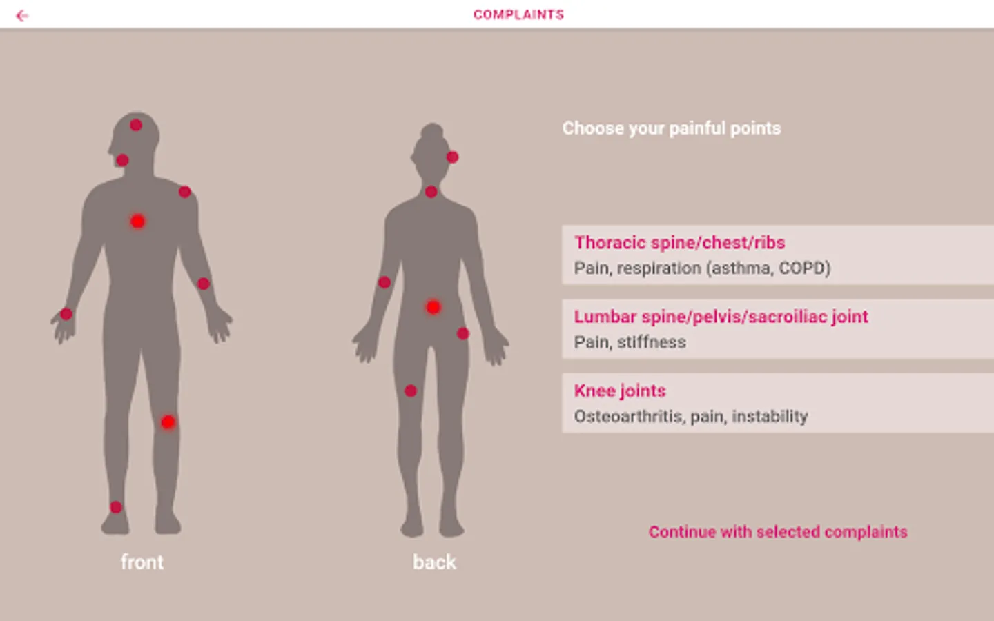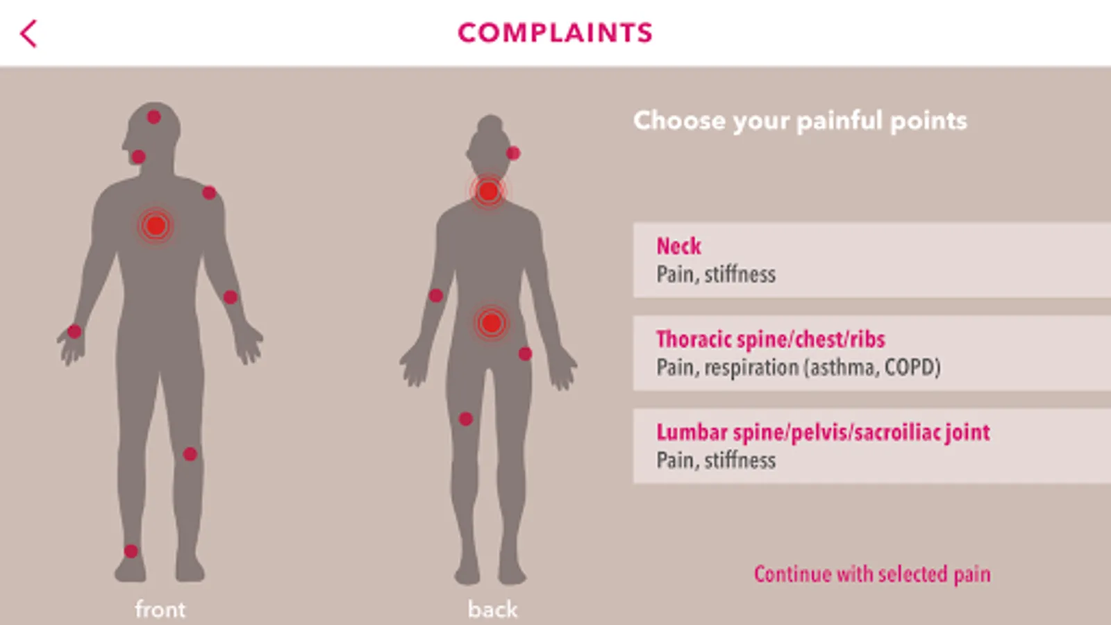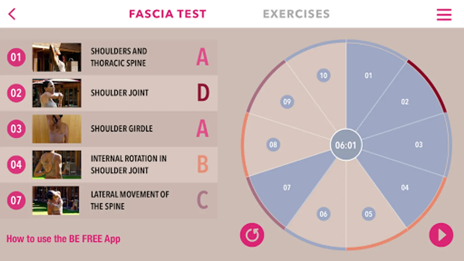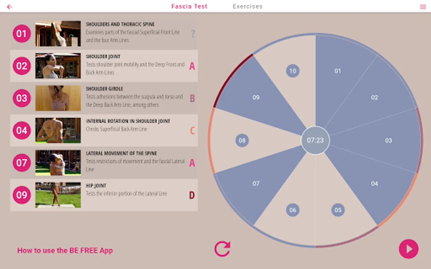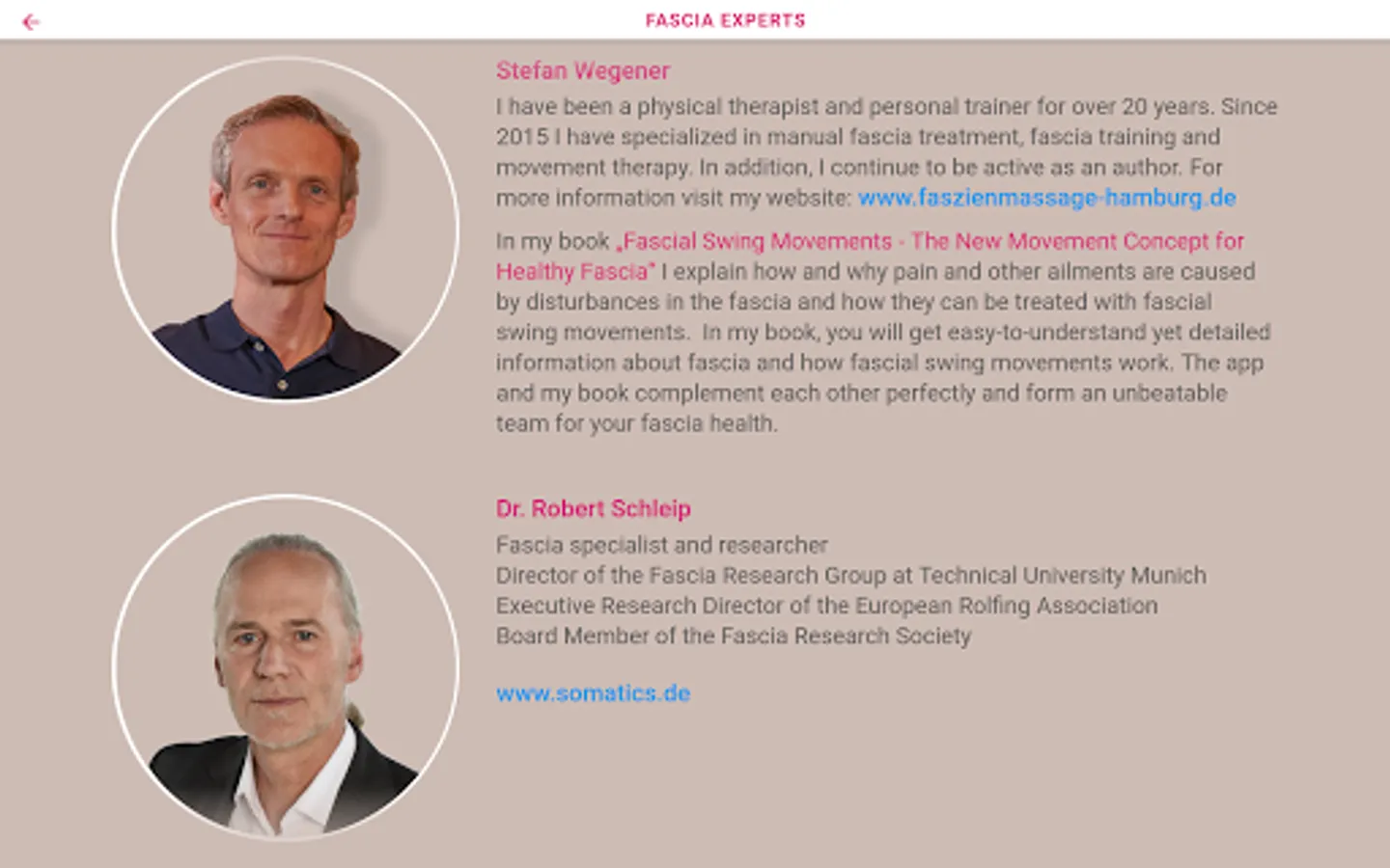 The fascial swing movements can be acquired by In-App Purchase. Get your individual training mix according to the test results. It consists of exercises for your imbalances and further swing movements that help you in maintaining your fascial health and fitness. Alternatively, you can have the workout designed according to your limitations or complaints, such as headaches or neck pain. The workout takes round about 10 minutes and can be done anywhere.
