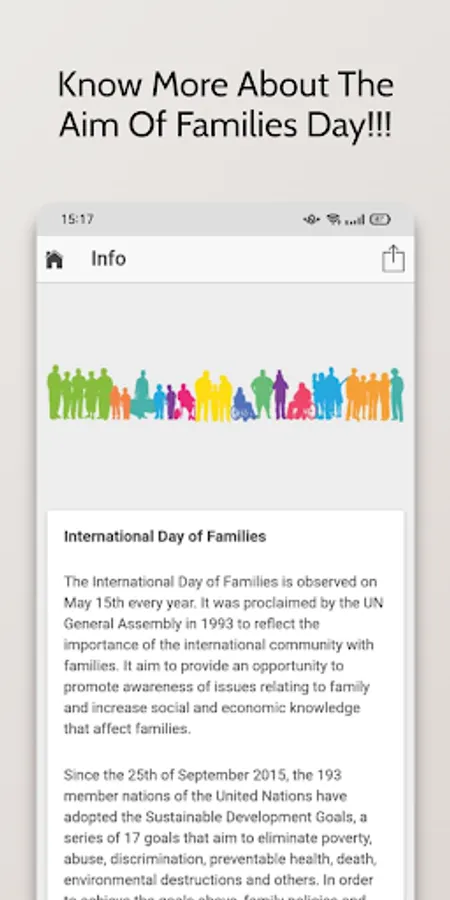 Happy Family Quotes, Messages, Greeting is an app that provide beautiful, interesting and meaningful Quotes, Messages, Photos, Wallpaper along with Family Quotes Greetings Messages from influential individual from different background to keep the International Day of Families awareness all day in this International Day of Families Greetings Cards Wishes Quotes with them. It will be a very convenient apps for you to send your greatest heartwarming wishes for your friend and family anytime and anywhere no matter which part of the world you are in.
